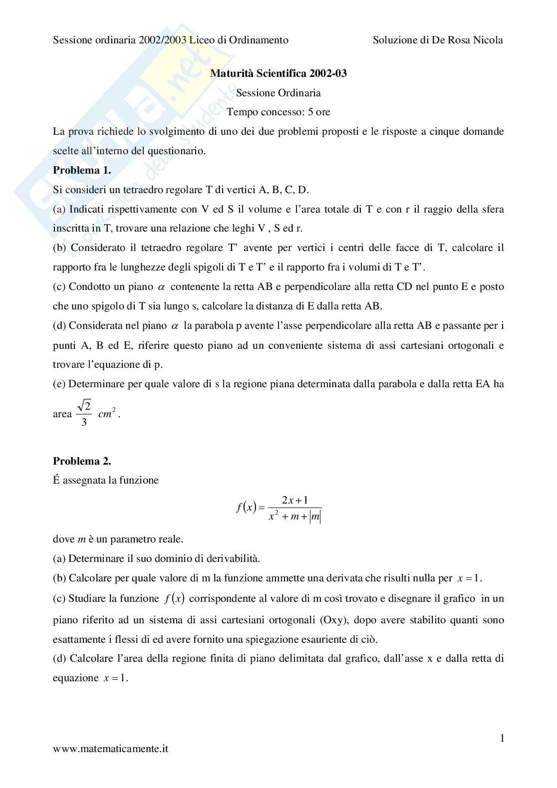 Sessione ordinaria 2002/2003 Liceo di Ordinamento Soluzione di De Rosa Nicola