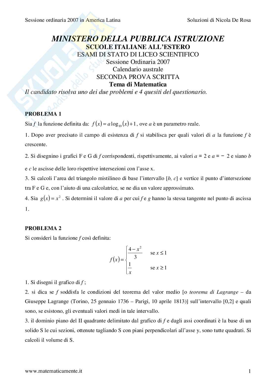 Il tema di matematica svolto per l'esame di stato per il liceo scientifico nelle scuole italiane all'estero, secondo il calendario australe. Sessione ordinaria 2007 in America Latina Soluzioni di Nicola De Rosa