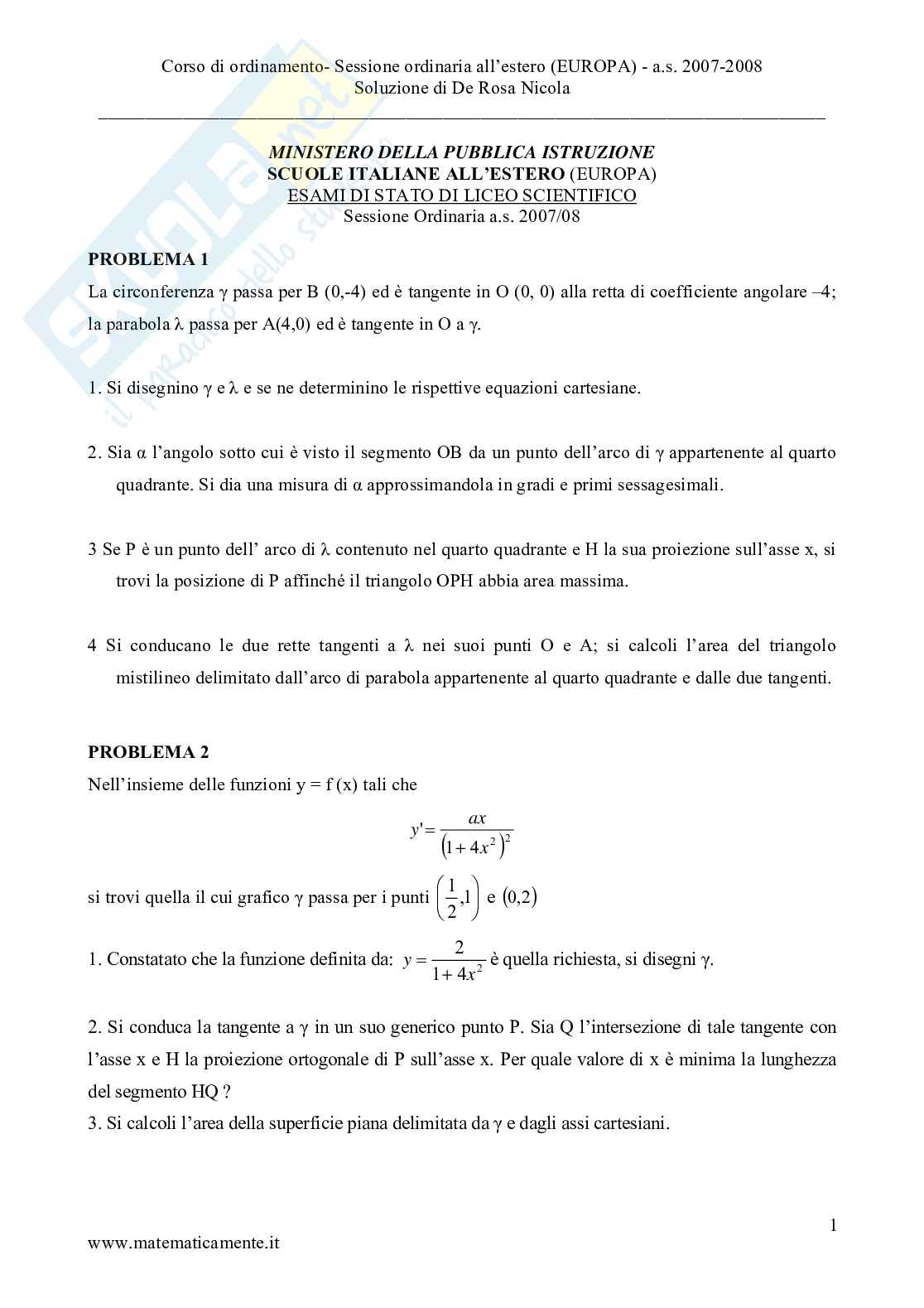 Corso di ordinamento- Sessione ordinaria all’estero (EUROPA) - a.s. 2007-2008