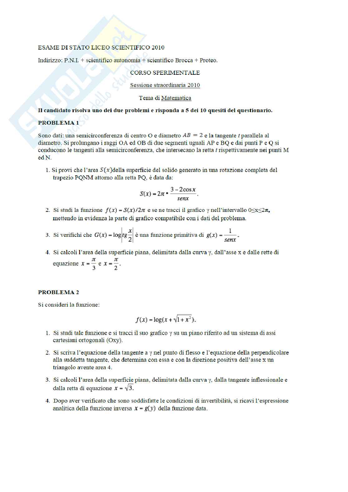 Esame di Stato 2010, Indirizzi: P.N.I. + scientifico autonomia + scientifico Brocca + Proteo. Corso sperimentale, sessione straordinaria 2010, tema di matematica. Svolgimento a cura di Nicola de Rosa