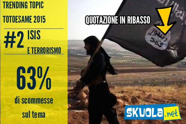 L'ISIS ERA LA FAVORITA- I grandi temi d'attualità hanno più volte fatto capolino all'esame di Stato. Se in passato argomenti come la crisi internazionale, l'Europa, l'espansione del Web hanno impegnato gli studenti all'esame di Stato, a marzo 2015 i maturandi, scossi dai fatti di terrorismo dello scorso gennaio, non potevano ignorare Charlie Hebdo. Era ben il 70% ad aspettarsi l'Isis tra le possibili tracce maturità 2015 . Altri argomenti particolarmente quotati erano stati di nuovo l'Expo 2015 e la disoccupazione giovanile.