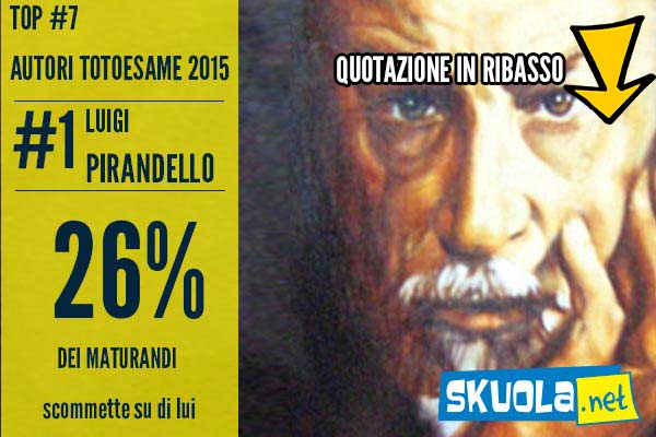 A MARZO ERANO TUTTI CON PIRANDELLO- Era Pirandello l'autore che i maturandi del 2015 si aspettavano (o si auguravano) come traccia d'esame di maturità per l'analisi del testo la prima parte dell'anno, dato che corrisponde al finale. Ben 1 su 3 si era schierato a favore del drammaturgo e romanziere siciliano, mentre a ruota lo seguivano Italo Svevo e Dante Alighieri. Poche preferenze riscuoteva Quasimodo, già uscito nel 2014, e Cesare Pavese, che riscuoteva solo il 5% dei voti.