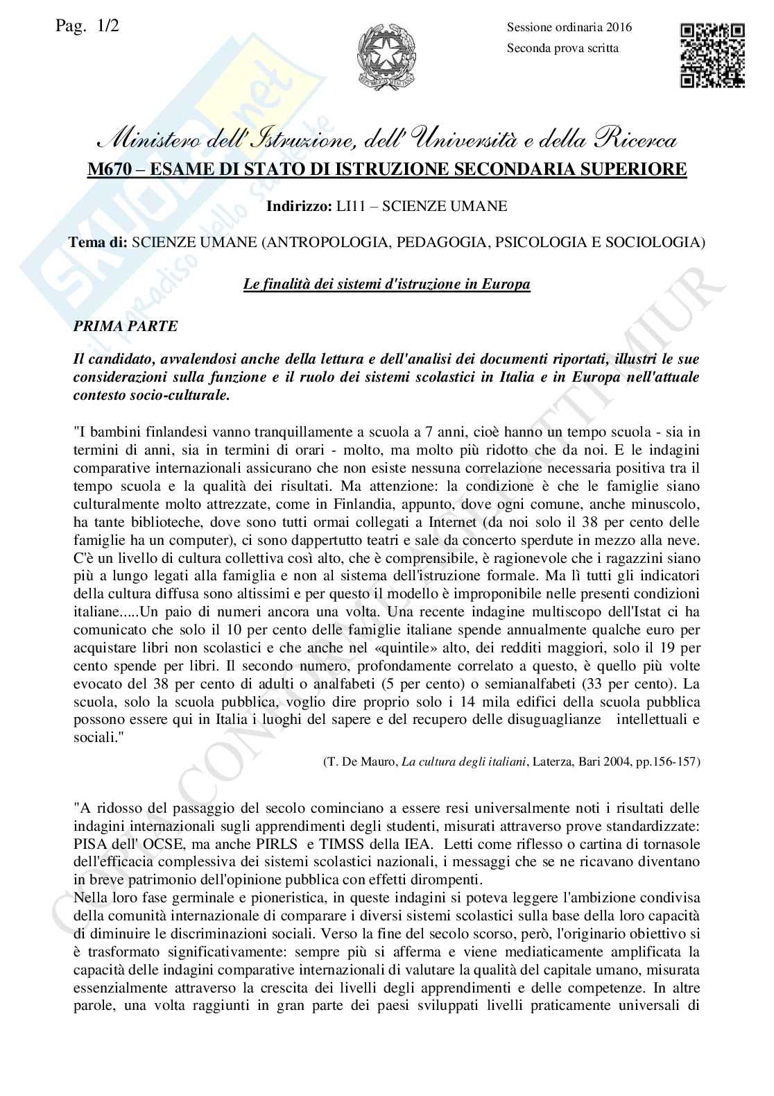 La prima parte della seconda prova di maturità 2016 del liceo delle scienze umane chiede ai ragazzi di illustrare le loro considerazioni sulla funzione e il ruolo dei sistemi scolastici in Europa. Possono aiutarsi con due fonti. La prima è un estratto del testo di Tullio De Mauro "La cultura degli italiani”. Fa una considerazione sulla scuola finlandese in cui dice che i ragazzi finlandesi passano meno tempo a scuola rispetto ai nostri, sia come durata dei percorsi sia in termini di orario. Tuttavia questo è possibile perchè il livello culturale delle famiglie è molto elevato, sia in termini di connettività internet, sia in quelli di strutture culturali come biblioteche, teatri, sale da concerto. Da noi questo sarebbe improponibile perchè il livello culturale medio è più basso e solo la scuola può permettere di recuperare questa disuguaglianza. La seconda fonte è invece un testo della fondazione Agnelli che parla del fatto che i test standard tipo Pisa Ocse hanno rivoluzionato il modo di valutare i sistemi scolastici, non in termini di anni di frequenza o titoli raggiunti (attainment), ma piuttosto di quello che si è imparato (achievement). La seconda parte della seconda prova di maturità 2016 del liceo delle scienze umane chiede ai maturandi di rispondere a 2 di 4 quesiti: il significato di competenza nel dibattito pedagogico, il nesso tra pedagogia ed educazione nel pensiero di John Dewey, principi e modalità di valutazione degli apprendimenti e spiegazione delle caratteristiche del curriculum per Jerome Bruner.