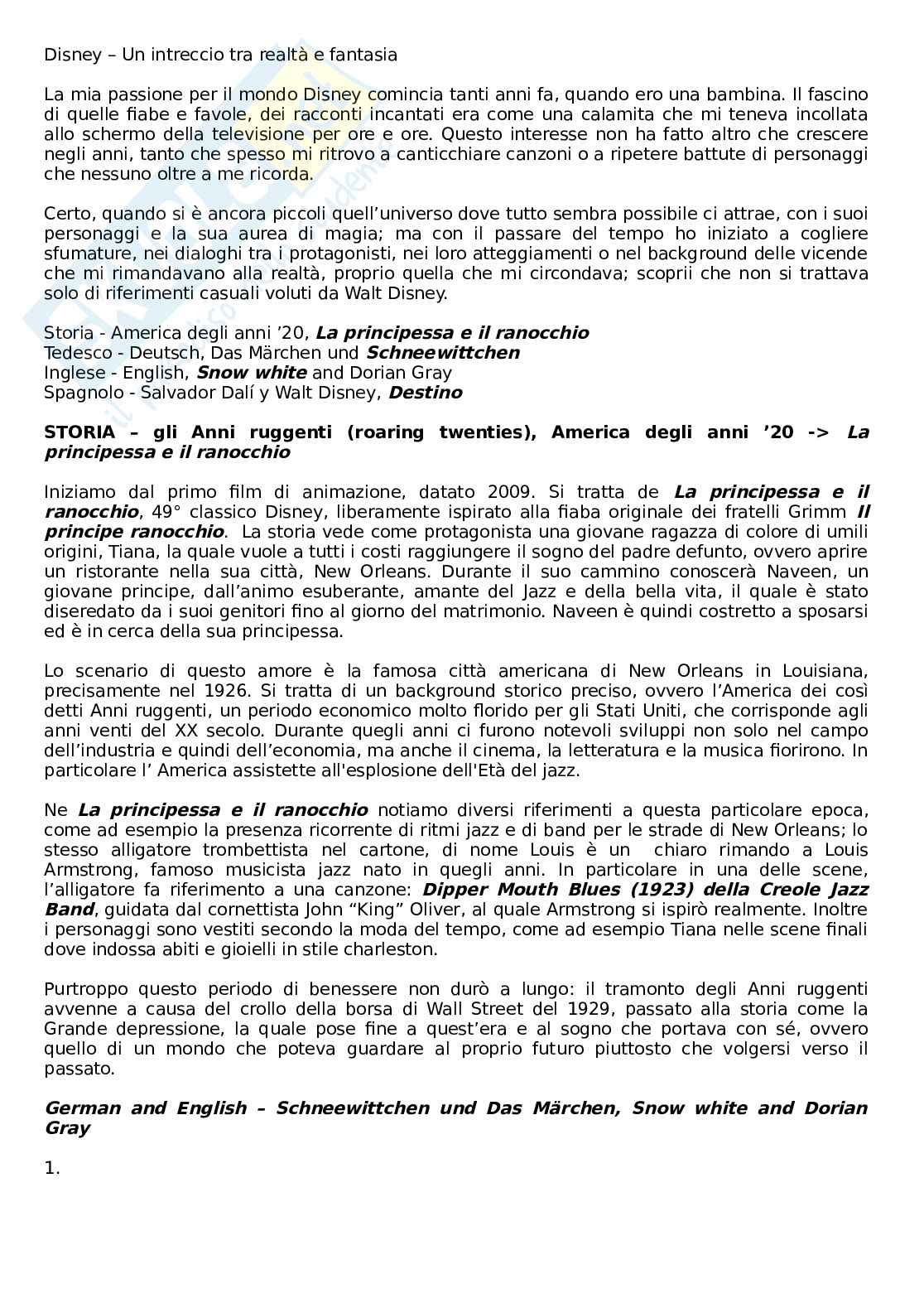 Questo percorso per tesina maturità liceo linguistico prende in riferimento il mondo Disney. La mia passione per il mondo Disney comincia tanti anni fa, quando ero una bambina. Il fascino di quelle fiabe e favole, dei racconti incantati era come una calamita che mi teneva incollata allo schermo della televisione per ore e ore. Questo interesse non ha fatto altro che crescere negli anni, tanto che spesso mi ritrovo a canticchiare canzoni o a ripetere battute di personaggi che nessuno oltre a me ricorda. Certo, quando si è ancora piccoli quell’universo dove tutto sembra possibile ci attrae, con i suoi personaggi e la sua aurea di magia; ma con il passare del tempo ho iniziato a cogliere sfumature, nei dialoghi tra i protagonisti, nei loro atteggiamenti o nel background delle vicende che mi rimandavano alla realtà, proprio quella che mi circondava; scoprii che non si trattava solo di riferimenti casuali voluti da Walt Disney.