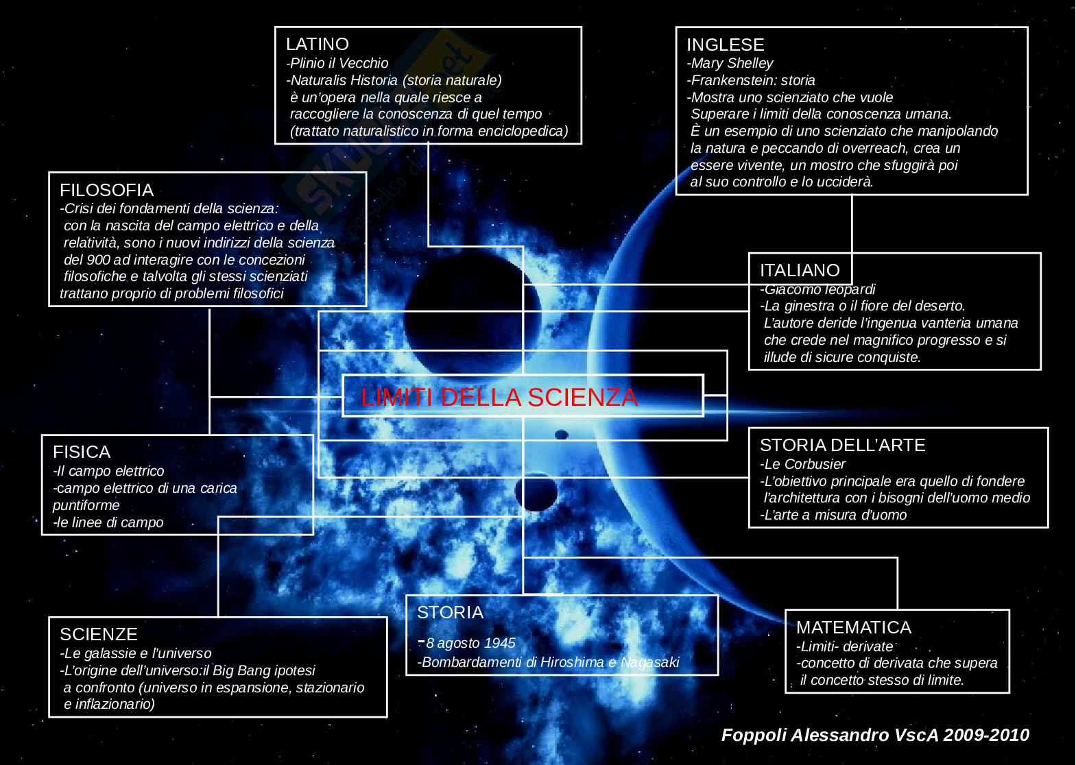 Mappa concettuale per liceo scientifico che collega tutte le materie el tema dei limiti della scienza: il campo eletrico, le galassie, i bombardamenti di Hiroshima e Nagasaki, Leopardi, Le Corbusier...
