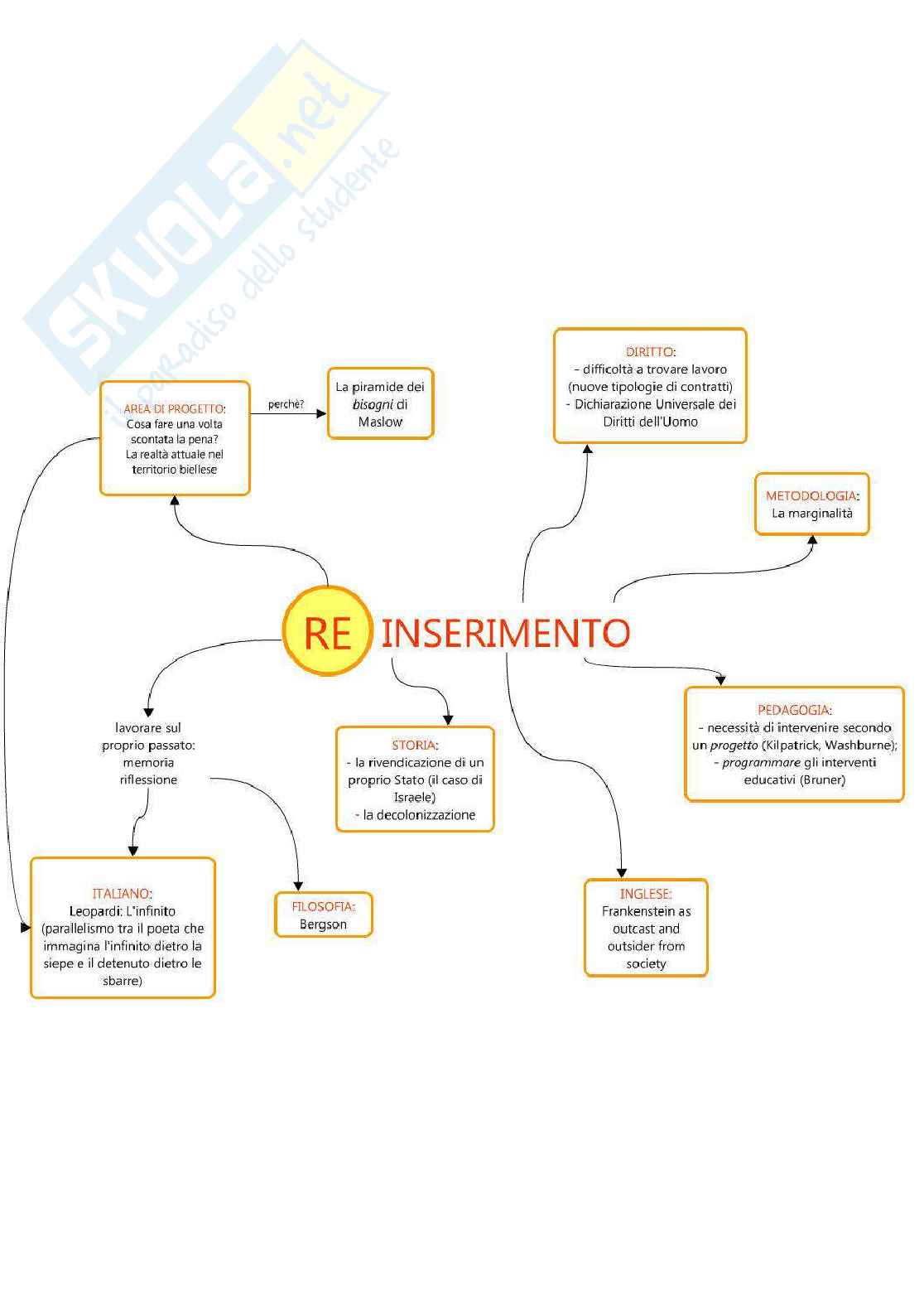 Mappa concettuale che collega le varie materie di un liceo socio-psicopedagicico al tema del reinserimento dopo aver scontato una pena, reerendosi a Leopardi, Bergson, il processo di decolonizzazione...
