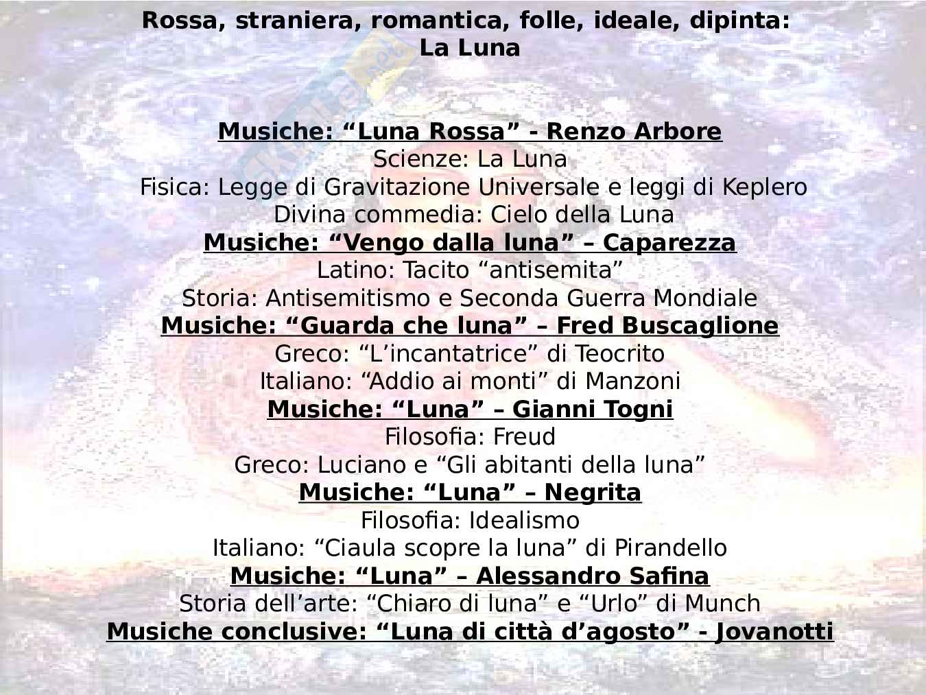 Percorso che collega alla Luna sette canzoni e per ognuna di esse vengono analizzati diversi argomenti come, ad esempio, la legge di gravitazione universale, l'antisemitismo, Teocrito, l'idealismo, Munch