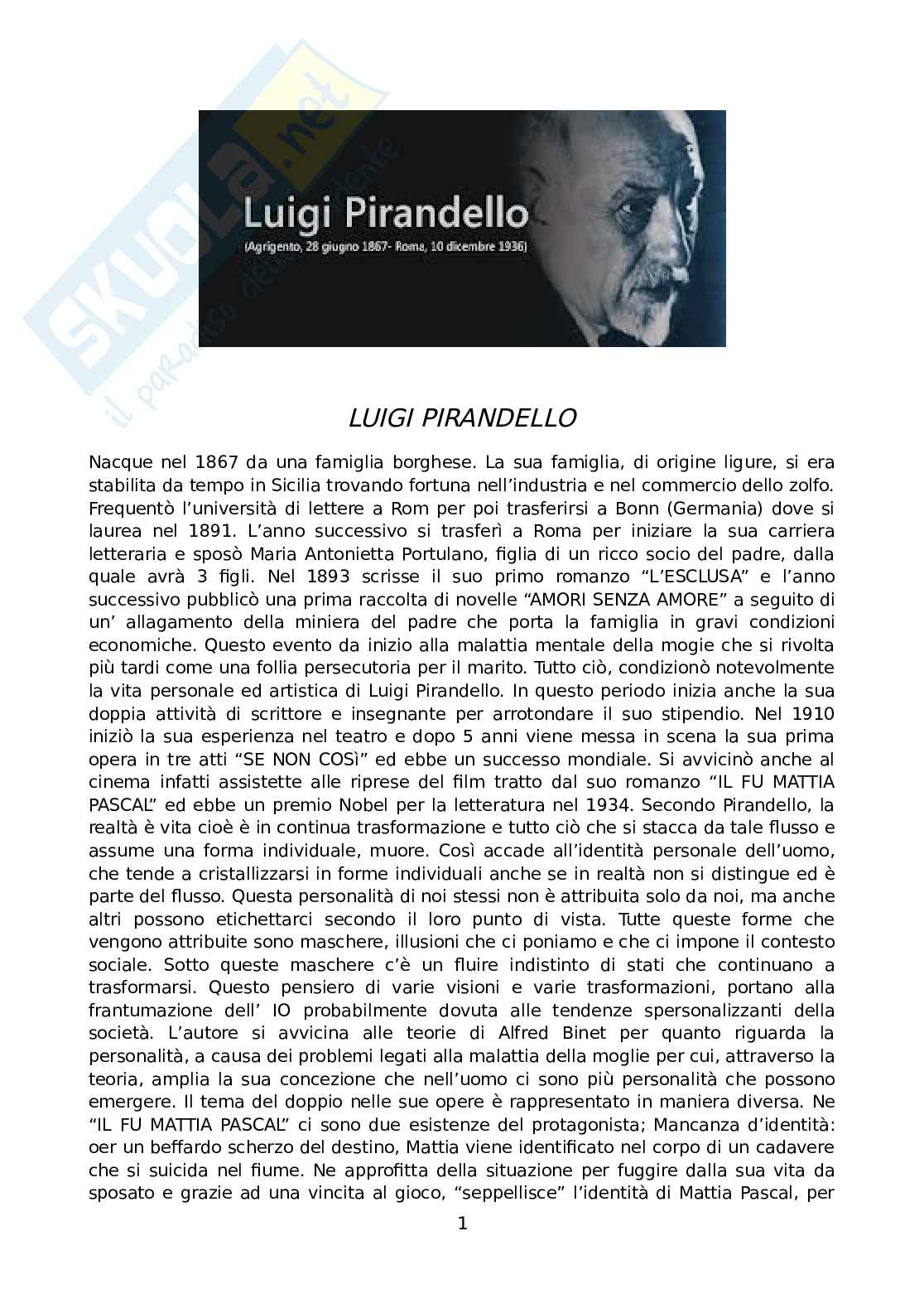 Nacque nel 1867 da una famiglia borghese. La sua famiglia, di origine ligure, si era stabilita da tempo in Sicilia trovando fortuna nell’industria e nel commercio dello zolfo. Frequentò l’università di lettere a Rom per poi trasferirsi a Bonn (Germania) dove si laurea nel 1891. L’anno successivo si trasferì a Roma per iniziare la sua carriera letteraria e sposò Maria Antonietta Portulano, figlia di un ricco socio del padre, dalla quale avrà 3 figli. Nel 1893 scrisse il suo primo romanzo “L'esclusa” e l’anno successivo pubblicò una prima raccolta di novelle “Amori senza amore” a seguito di un’ allagamento della miniera del padre che porta la famiglia in gravi condizioni economiche. Questo evento da inizio alla malattia mentale della mogie che si rivolta più tardi come una follia persecutoria per il marito. Tutto ciò, condizionò notevolmente la vita personale ed artistica di Luigi Pirandello. In questo periodo inizia anche la sua doppia attività di scrittore e insegnante per arrotondare il suo stipendio. Nel 1910 iniziò la sua esperienza nel teatro e dopo 5 anni viene messa in scena la sua prima opera in tre atti “SE NON COSì” ed ebbe un successo mondiale. Si avvicinò anche al cinema infatti assistette alle riprese del film tratto dal suo romanzo “Il fu Mattia Pascal” ed ebbe un premio Nobel per la letteratura nel 1934. Secondo Pirandello, la realtà è vita cioè è in continua trasformazione e tutto ciò che si stacca da tale flusso e assume una forma individuale, muore. Così accade all’identità personale dell’uomo, che tende a cristallizzarsi in forme individuali anche se in realtà non si distingue ed è parte del flusso. Questa personalità di noi stessi non è attribuita solo da noi, ma anche altri possono etichettarci secondo il loro punto di vista. Tutte queste forme che vengono attribuite sono maschere, illusioni che ci poniamo e che ci impone il contesto sociale. Sotto queste maschere c’è un fluire indistinto di stati che continuano a trasformarsi. Questo pensiero di varie visioni e varie trasformazioni, portano alla frantumazione dell’ IO probabilmente dovuta alle tendenze spersonalizzanti della società. L’autore si avvicina alle teorie di Alfred Binet per quanto riguarda la personalità, a causa dei problemi legati alla malattia della moglie per cui, attraverso la teoria, amplia la sua concezione che nell’uomo ci sono più personalità che possono emergere. Il tema del doppio nelle sue opere è rappresentato in maniera diversa. Ne “Il fu Mattia Pascal” ci sono due esistenze del protagonista; Mancanza d’identità: per un beffardo scherzo del destino, Mattia viene identificato nel corpo di un cadavere che si suicida nel fiume. Ne approfitta della situazione per fuggire dalla sua vita da sposato e grazie ad una vincita al gioco, “seppellisce” l’identità di Mattia Pascal, per creare un alter-ego: Adriano Meis. Si il protagonista si illuse di poter vivere felicemente, poi si rende conto che non esiste perché in realtà è il “Fu Mattia Pascal” , l’identità che gli è altri gli avevano dato rendendolo un fantasma senza volto. Questo romanzo, spiega come l’uomo non può liberarsi dalla maschera che gli viene imposta dalla società. Invece nel romanzo “Uno nessuno e centomila”, il protagonista, Vitangelo Moscarda, scopre che gli altri hanno di lui una visione diversa da quella che egli stesso si è attribuito scoprendo di non essere uno, ma centomila; è convinto che il suo aspetto sia perfetto. Un giorno la moglie lo manda in crisi perche gli fa notare che ha il naso leggermente deviato. Va in crisi perché si rende conto che la moglie lo vede diverso da modo in cui si guarda allo specchio. Scopre quindi che le infinite “forme” che gli attribuiscono, sono forme in cui non si riconosce e si rende conto che non è più riconoscibile in nessuna identità L’espandersi dell’industria, l’utilizzo delle macchine al posto delle braccia umane, non fa altro che rendere l’uomo come un ingranaggio di una grande macchina. L’unica via di fuga è l’immergersi nel mondo fantastico ed immaginario (filosofia del lontano). Per la visione propria e degli altri si dice “1 e centomila”. Secondo il relativismo conoscitivo di Pirandello, la realtà è multiforme e ci sono diverse prospettive da cui guardarla e ognuno ha la propria verità che dipende dal suo modo di vedere le cose.