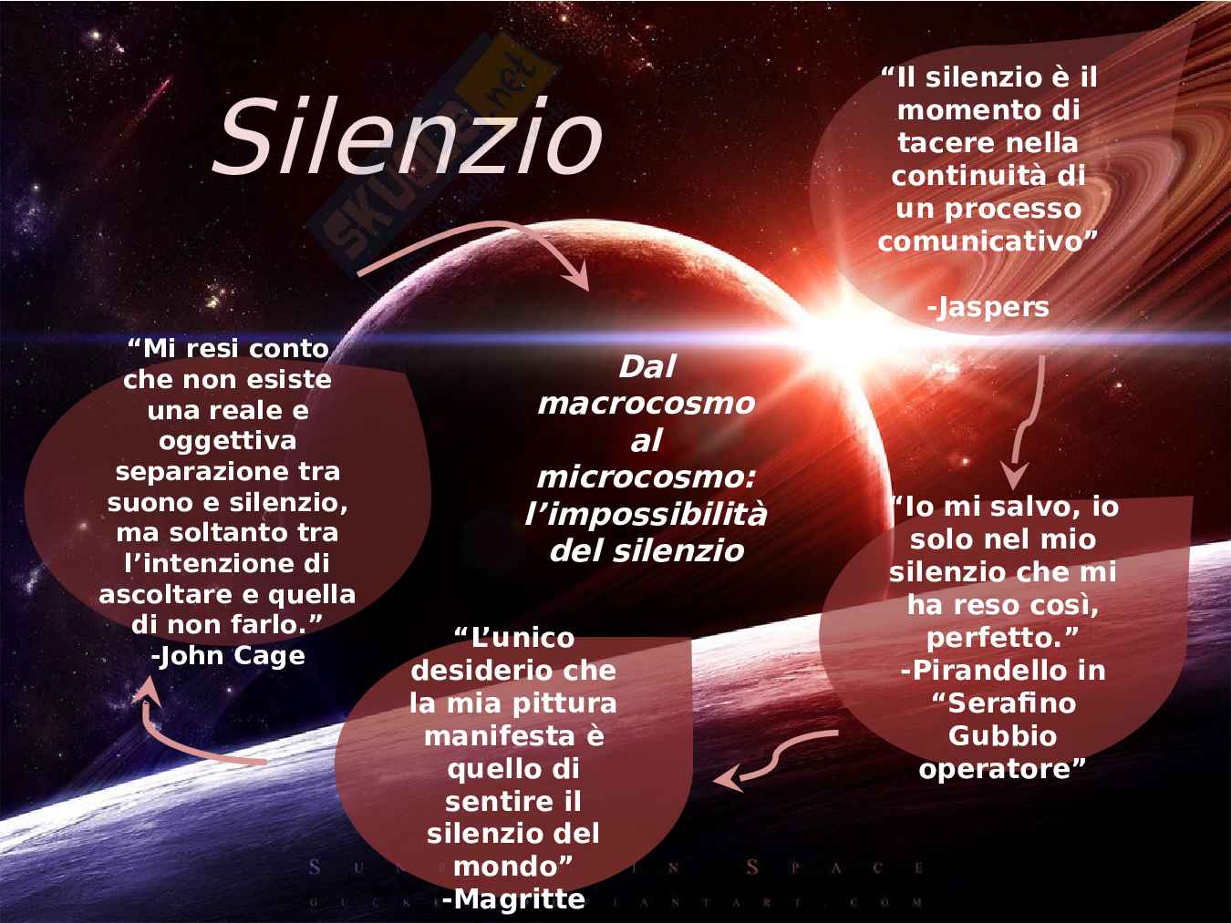 Tesina per liceo scientifico che dimostra in che modo, collocando adeguatamente il silenzio nelle relazioni umane, diventa ricerca del silenzio dal macrocosmo al microcosmo.