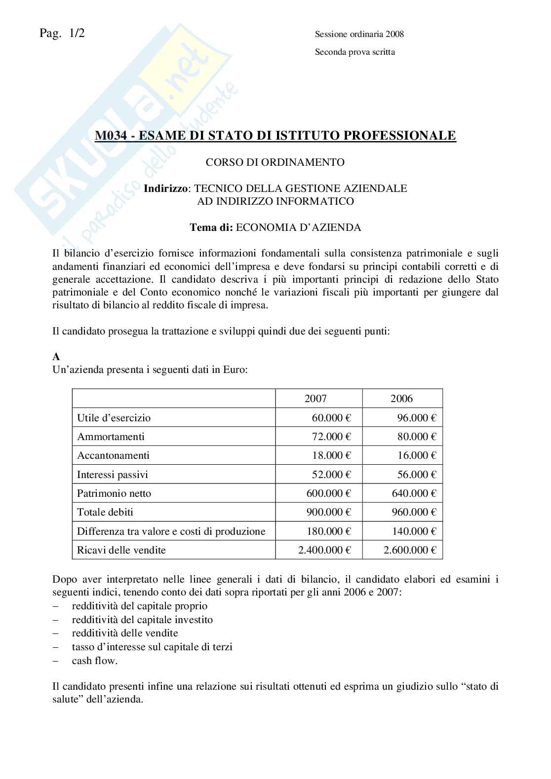 Un’azienda presenta i seguenti dati in Euro: 2007 2006
