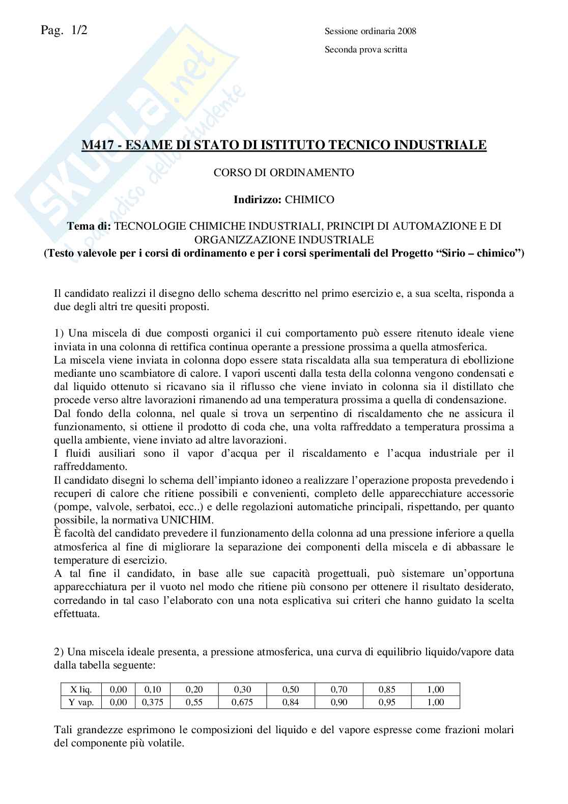 Tema di: TECNOLOGIE CHIMICHE INDUSTRIALI, PRINCIPI DI AUTOMAZIONE E DI