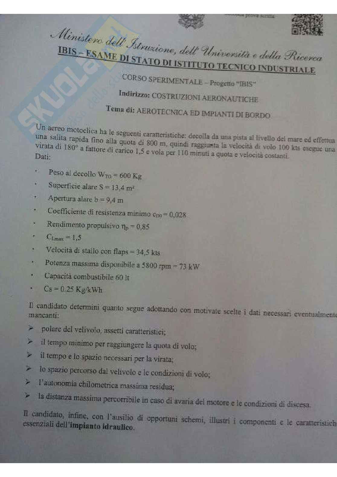 Traccia della prova di Aerotecnica ed impianti di bordo per la seconda prova dell'esame di Maturità 2013 per Istituto Tecnico Industriale indirizzo costruzioni aeronautiche.