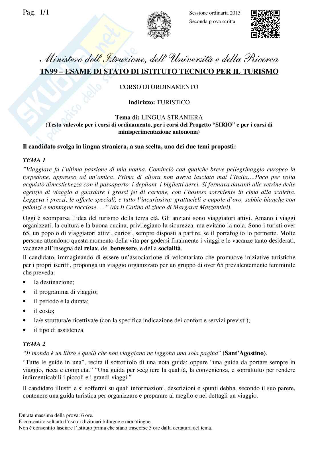 Lingua straniera - Istituto Turismo - Maturità 2013 Pag. 1