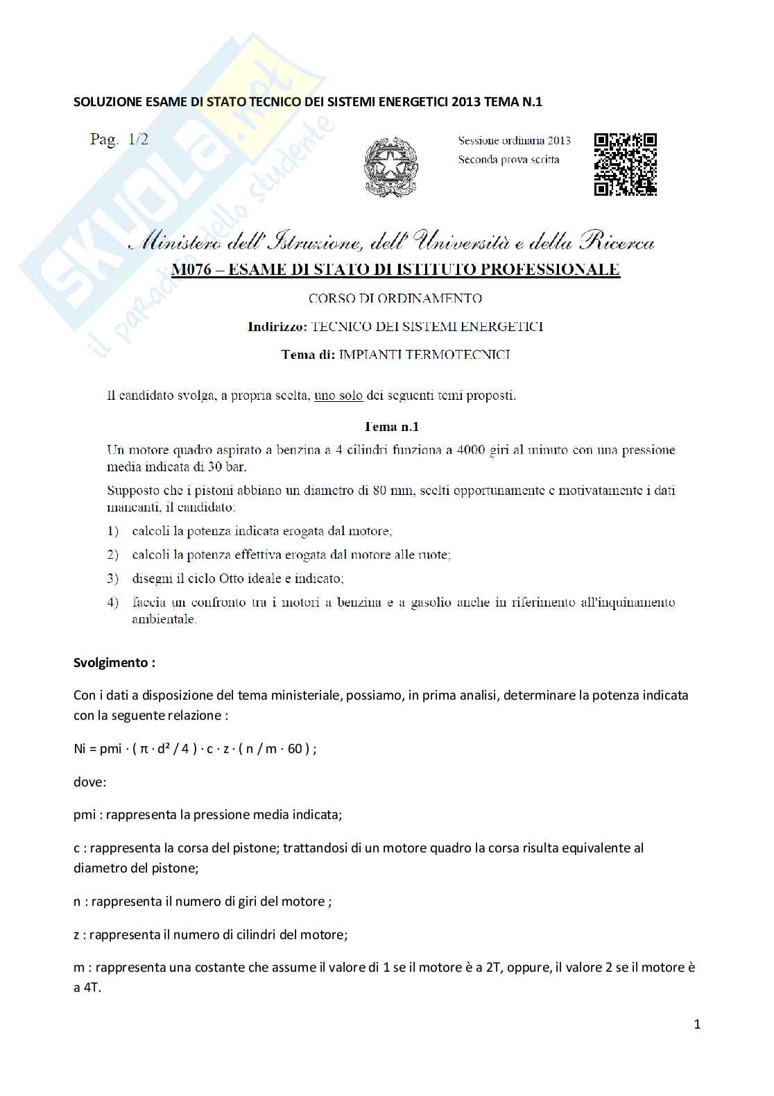La prova ministeriale consiste nel determinare la potenza di un motore a benzina a quattro cilindri in funzione del numero di giri e della pressione media indicata. Nel punto successivo viene rappresentato il ciclo otto ideale e indicato e, nella parte finale, viene data una descrizione sommaria delle differenze sostanziali tra un propulsore a benzina e uno diesel, accennando ai problemi di inquinamento ambientale che possono produrre.