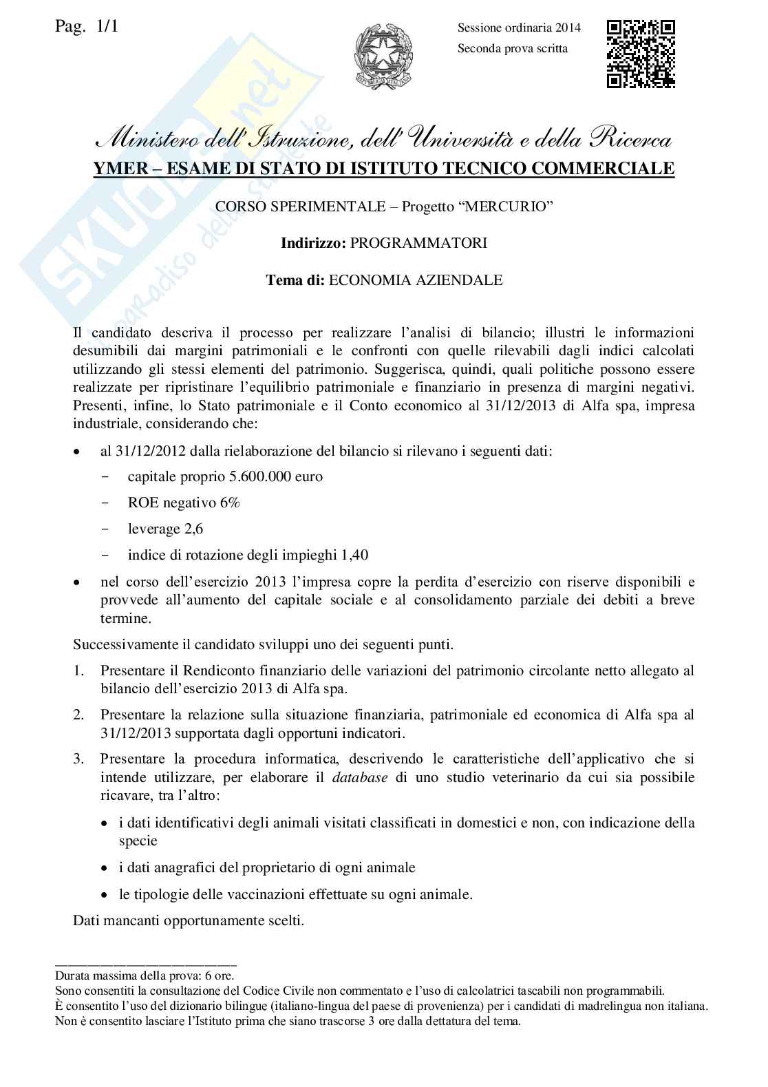 Tracce e soluzione della seconda prova di Economia aziendale per la maturità 2014 dell'Istituto tecnico commerciale, indirizzo programmatori, progetto Mercurio