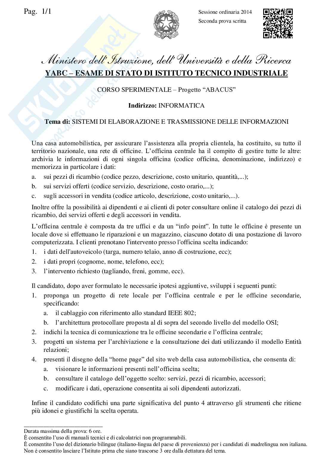 Ecco la traccia della seconda prova di sistemi di elaborazione e trasmissione delle informazioni per la maturità 2014 dell'Istituto tecnico industriale, indirizzo informatico e telematico, progetto Brocca.
