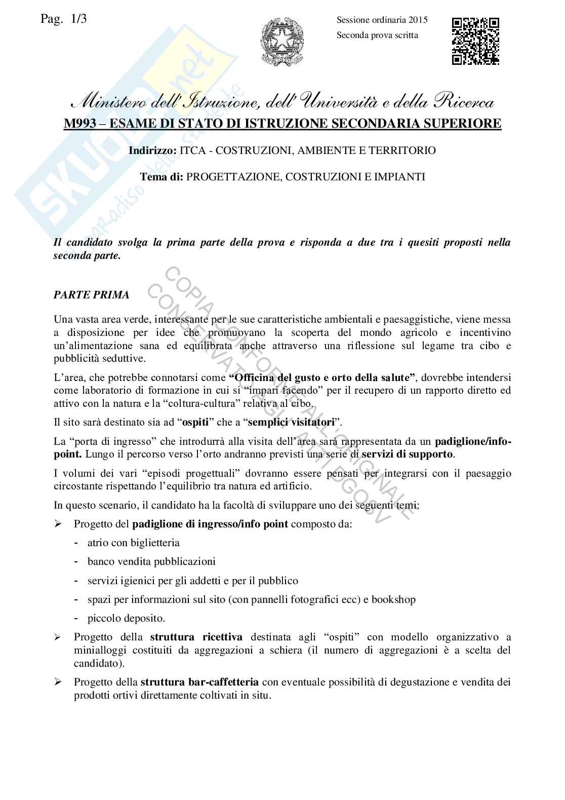 Ecco la traccia della seconda prova di Progettazione, Costruzioni e Impianti per la maturità 2015 dell'Istituto tecnico Costruzione, ambiente e territorio.