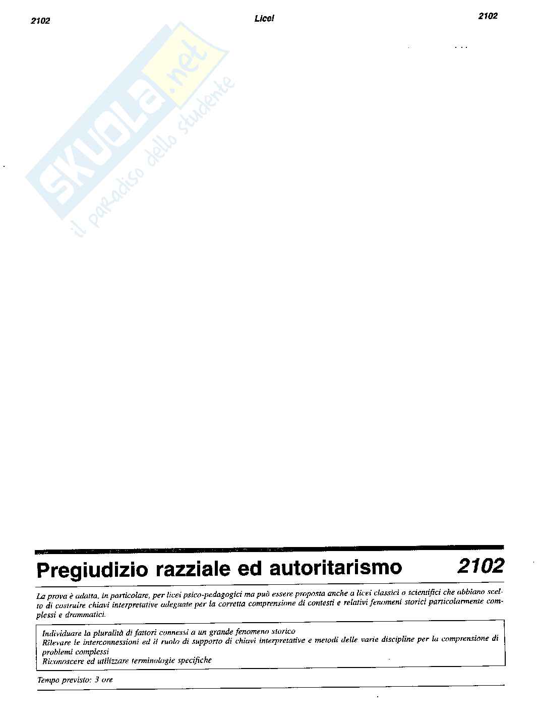 Proposta di terza prova per studenti del liceo psico-pedagogico riguardante il pregiudizio razziale e l'autoritarismo. Materie trattate: Filosofia, inglese, psico-pedagogia, storia
