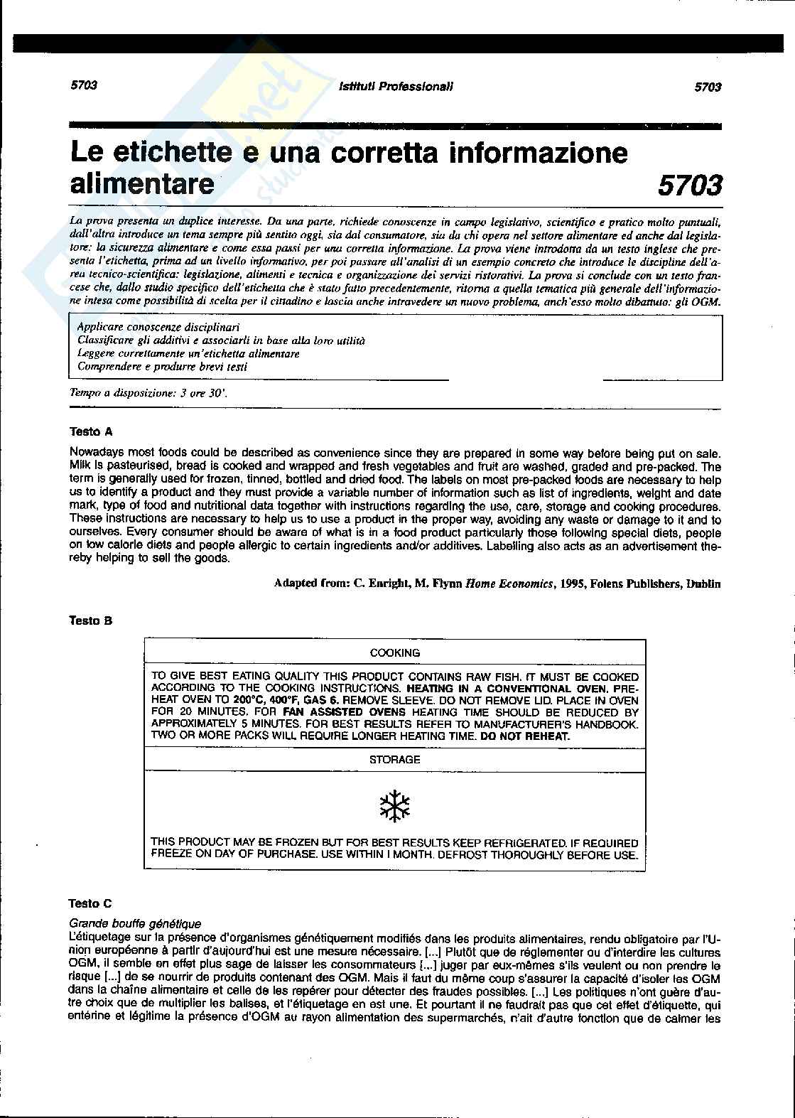 Proposta di terza prova per studenti dell'Istituto professionale IPSSAR. Materie trattate: Inglese, legislazione, alimenti, tecnica e organizzazione dei servizi ristorativi