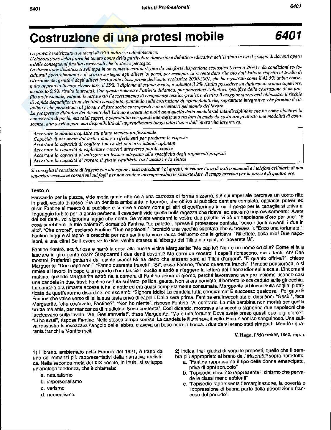Proposta di terza prova di maturità per studenti dell'Istituto professionale per l'industria e l'artigianato, indirizzo odontotecnico sulla costruzione di una protesi mobile