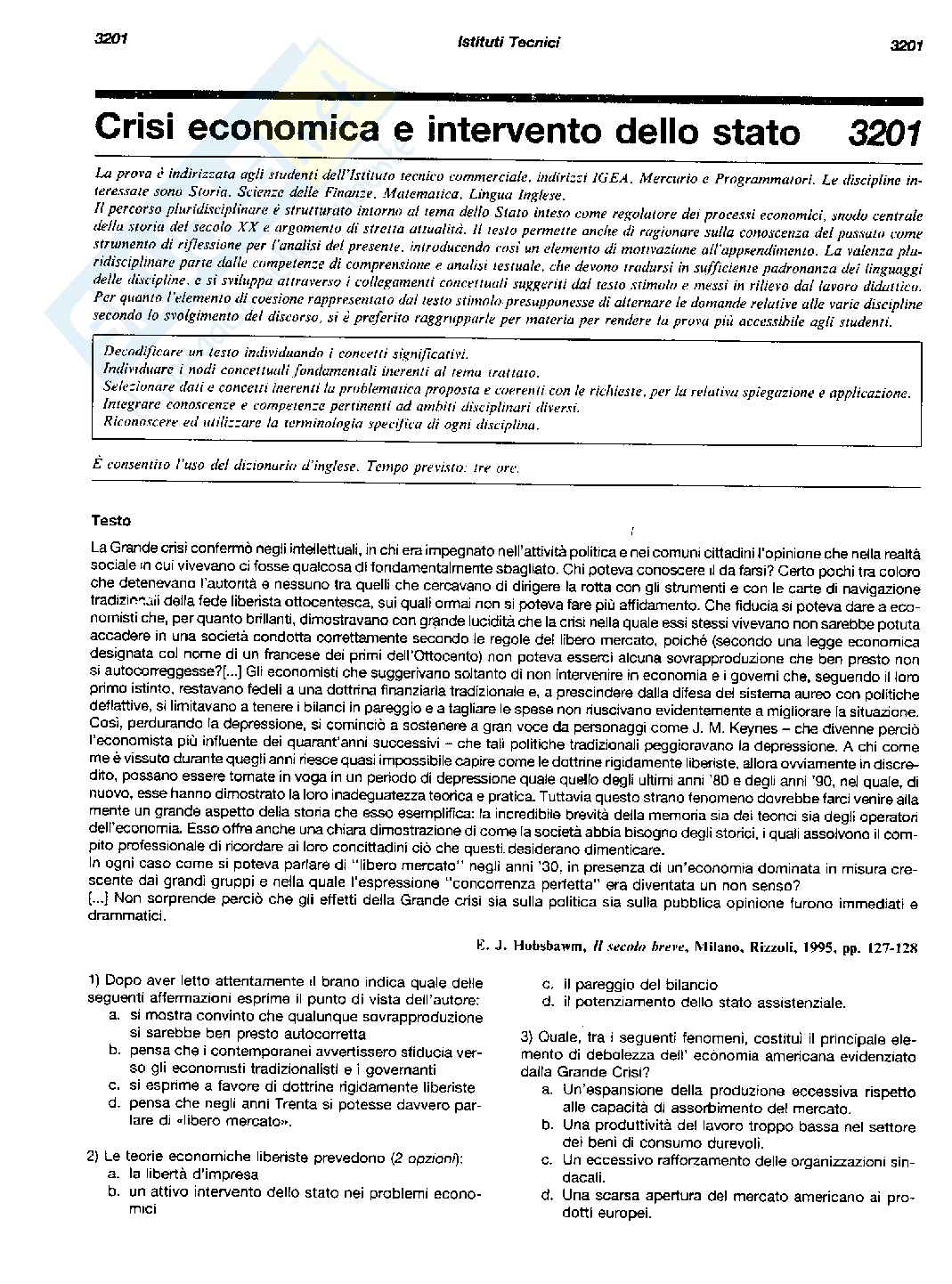 Proposta di terza prova di maturità per studenti dell'Istituto tecnico commerciale sulla crisi economica e l'intervento dello Stato. Materie trattate: Storia, scienza delle finanze, matematica, inglese