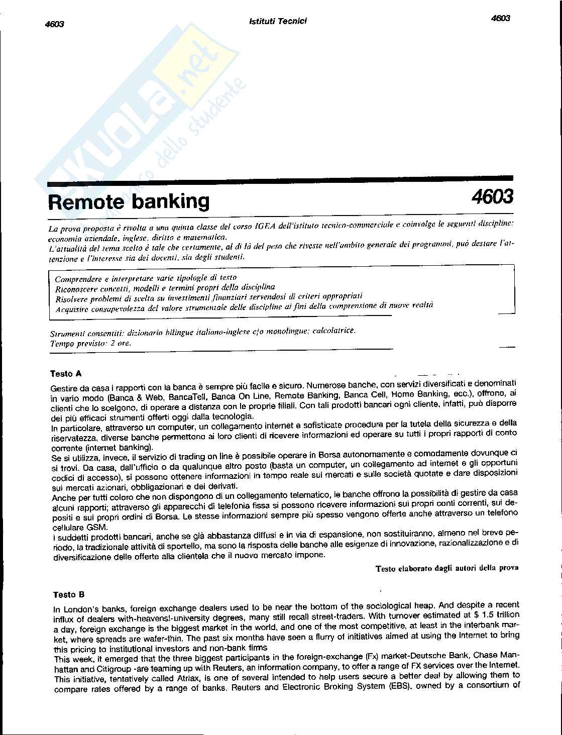 Proposta di terza prova di maturità per studenti dell'Istituto tecnico commerciale, IGEA sul remote banking. Materie trattate: Economia aziendale, inglese, diritto, matematica