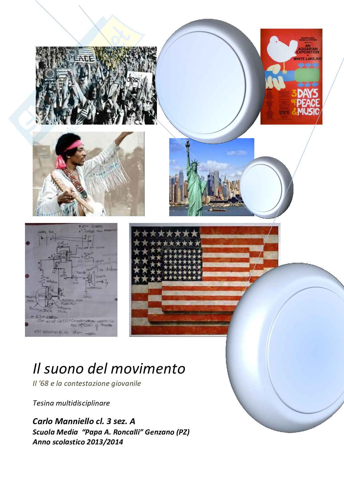 La seguente tesina esame terza media descrive il '68. Gli argomenti che permette di sviluppare la tesina sono: Tecnica:Amplificatore e leggi di Ohm, Scienze:Il fenomeno della risonanza acustica, Matematica:Il parallelepipedo e il rettangolo aureo, Musica:Jimi Hendrix e il concerto di Woodstock, Storia:Il '68 e la contestazione giovanile in tutto il mondo, Arte:La pop art e Andy Warhol, Italiano:Il fenomeno del consumismo, Letteratura:Pier Paolo Pasolini e il romanzo "Tommaso", Geografia:L'economia degli Stati Uniti, Educazione Fisica:Il problema della cattiva alimentazione Statunitense, Educazione Civica:La dichiarazione d'Indipendenza degli Stati Uniti, Inglese:Ellis Island, Francese:La Repubblica presidenziale francese e statunitense.