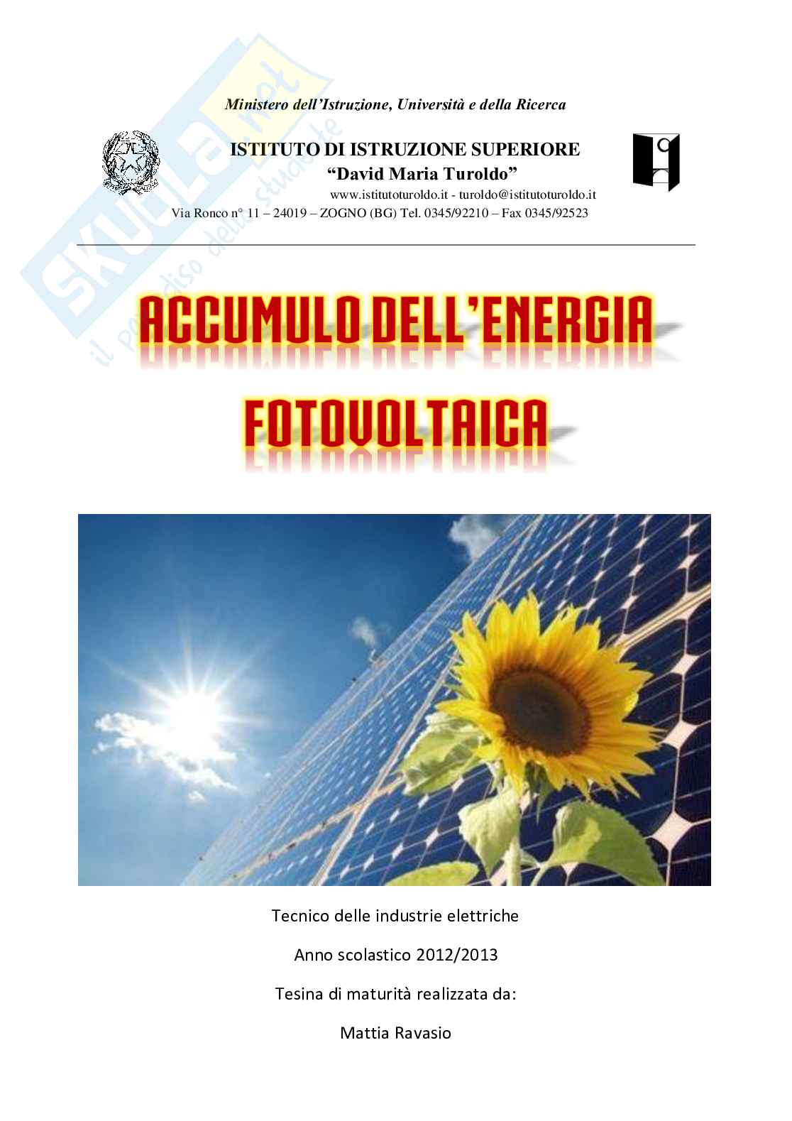 Questa tesina di maturità descrive l'accumulo dell'energia fotovoltaica. La tesina permette i seguenti collegamenti interdisciplinari: in Italiano Montale, Ungaretti, in Storia il periodo post ricostruzione, in Tecnica professionale elettrica la relazione della tesina, in Inglese la nascita delle risorse rinnovabili.