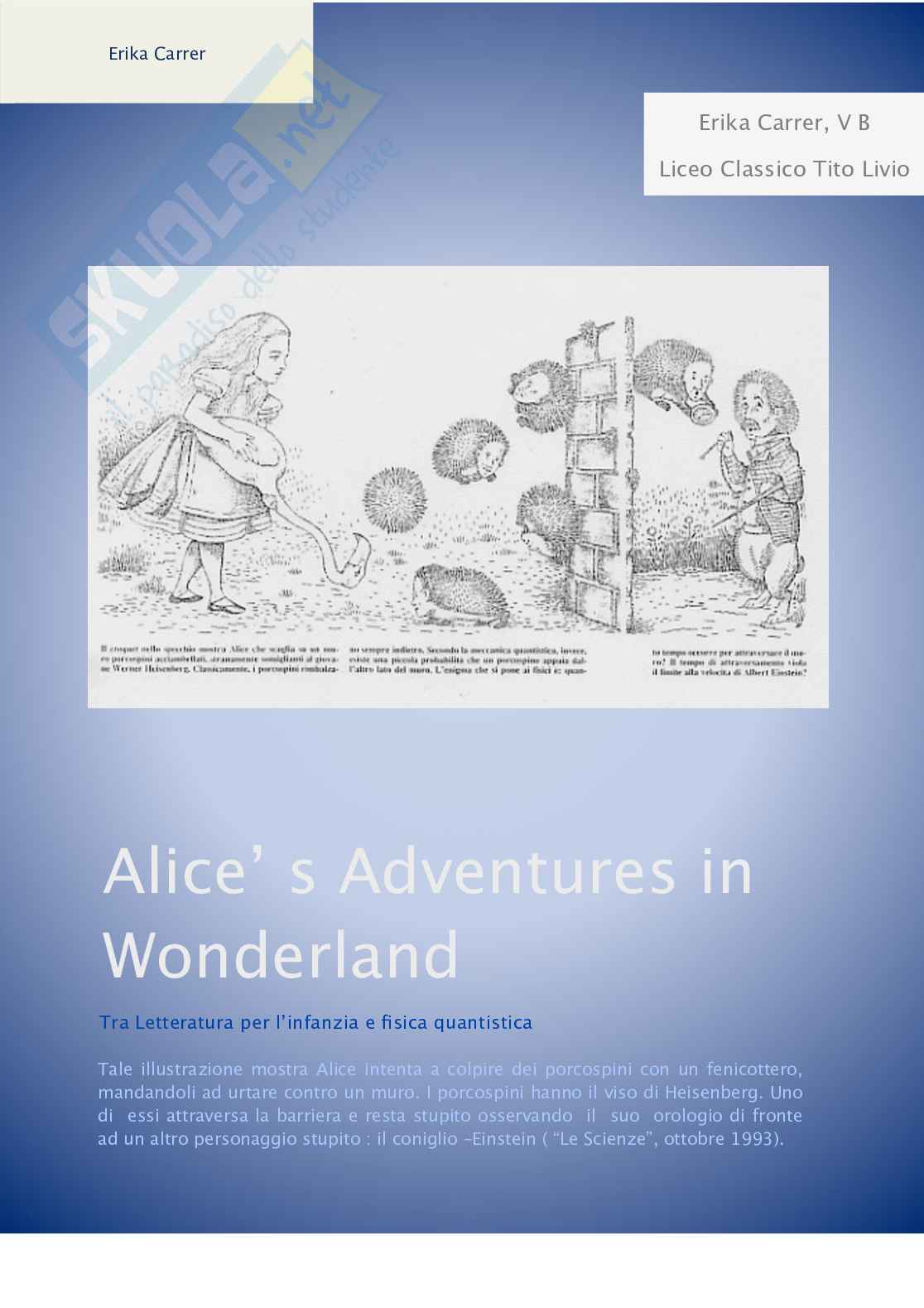 Obbiettivo della tesina che mi accingo a presentare è quello di “mettere in luce” le anticipazioni e le intuizioni che avvicinano Alice nel paese delle Meraviglie alle leggi della fisica quantistica che da lì a pochi decenni avrebbero sovvertito le idee della fisica classica introducendo un nuovo modo di pensare il mondo. L'obiettivo della mia tesina di maturità classica è quindi quello di creare una connessione tra Alice in wonderland e le leggi della fisica quantistica.