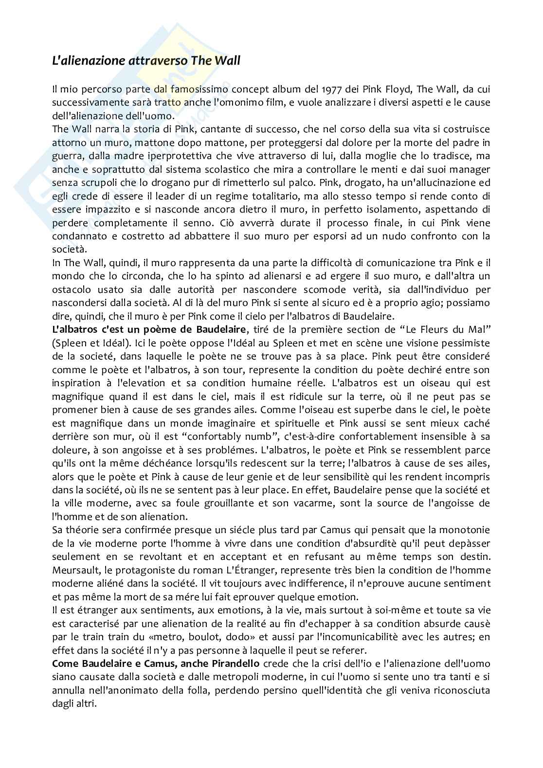 La mia tesina di maturità descrive il tema dell'alienazione attraverso la canzone The Wall dei Pink Floid. Gli argomenti che la tesina permette di sviluppare sono i seguenti: in Francese L'albatros di Charles Baudelaire e L'Etranger, Albert Camus, in Italiano Pirandello e i Quaderni di Serafino Gubbio operatore, in Filosofia l'alienazione in Marx, in Inglese 1984 di George Orwell, in Storia dell'arte Alienato con la monomania del comando militare di Theodore Géricault, in Storia la deportazione degli ebrei, in Tedesco Maßnahmen gegen die Gewalt , Bertold Brecht.