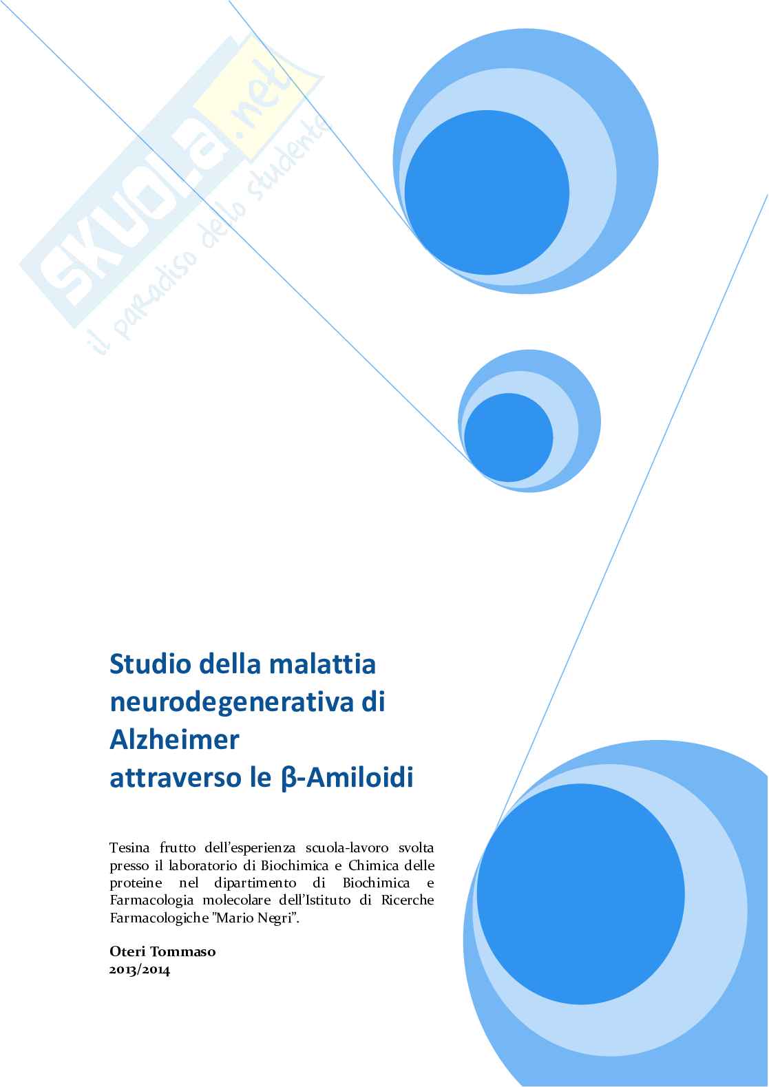 La mia tesina di maturità descrive la malattia degenerativa dell'Alzheimer. In primis, ringrazio la scuola e l’istituto di ricerca Mario Negri per l’opportunità che mi è stata data: svolgere uno stage estivo presso uno dei migliori centri di ricerca d’Italia; ringrazio per aver avuto la possibilità di lavorare al fianco di ricercatori professionisti con anni di esperienza alle spalle. Essi hanno saputo aprirmi gli occhi su un mondo, che, a volte, rimane un po’ oscuro e che per chi osserva non è mai molto chiaro quanto faccia per noi. Il mio grazie va anche ad Alfredo e Alessandro, i miei responsabili di laboratorio, che mi hanno seguito passo per passo, rispondendo ad ogni domanda e perplessità mi venisse in mente, rendendomi così sicuro e autonomo davanti a strumenti e tecniche a me sconosciute fino ad allora. Infine il mio grazie più grande va a tutti i summer students che questa estate, come me, hanno passato un’esperienza di lavoro unica; un mese e mezzo nel quale ci siamo accompagnati a vicenda lungo un percorso pieno d’impegno, che a volte, tra attività, lezioni, esperimenti, orari ristretti e un sole che spaccava le pietre ma anche temporali che quando arrivavano non accennavano a finire, poteva risultare ed è risultato faticoso, ma giorno dopo giorno con il sorriso sulle labbra si è rivelato stupendo.