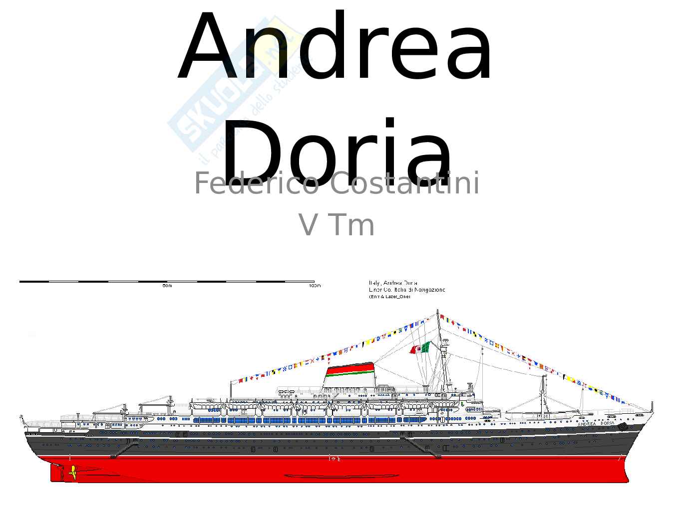 La seguente tesina di maturità ha come obiettivo quello di descrivere la storia della nave Andrea Doria, effettuando dei collegamenti interdisciplinari con le seguenti materie: in Navigazione si analizzano la lossodromia e l'ortodromia; in Economia vengono analizzati i costi d'esercizio; in Elettrotecnica i radar, i controlli. Tra gli altri argomenti che la tesina sviluppa si ricordano infine: in Inglese l'insurance; in Storia il secondo dopoguerra e infine l'argomento relativo alla nebbia.