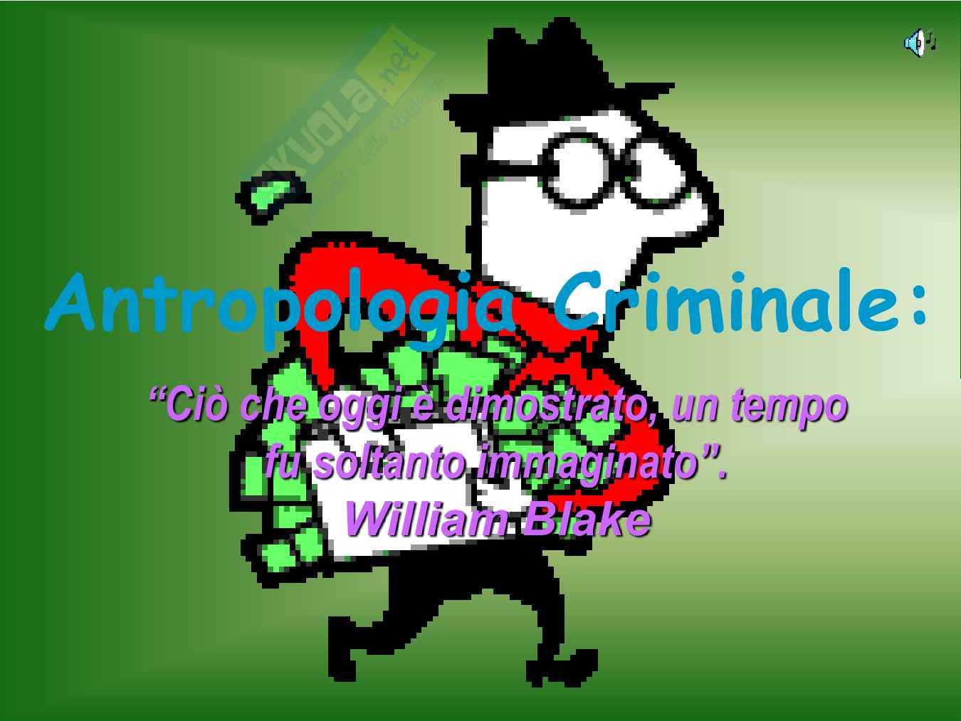 Sommario: Profilo storico 1865/70 apice del positivismo 1839 congressi scientifici italiani con scienziati da tutt'Europa, ma lo Stato unitario è ancora da prefigurare Accolte le idee positiviste Rinnovamento scientifico italiano: medici e fisiologi Costruzione di una scienza, che non rinuncia al ruolo di guida culturale e che cerca di elaborare una sua concezione della realtà e dell'uomo Cesare Lombroso (1835-1909 I primi interessi sono di natura letteraria, così stupisce la sua scelta del 1805 di frequentare la facoltà di medicina a Pavia Decisivo il suo incontro con Marzolo, linguista e glottologo(colui che studia i sistemi linguistici nella storia), il "Darwin" dell'antropologia italiana. Egli intende utilizzare "il metodo sperimentale sintetico per opporre al debole artificiato bagliore della metafisica la potenza dei raggi sconnessi, forse, e fuggevoli, ma sinceri dei fatti sinteticamente raccolti e raggruppati" (C.Lombroso, Frammenti medico-psicologici, in "Gazzetta Medica Italiana-Lombardia. Appendice psichiatrica)