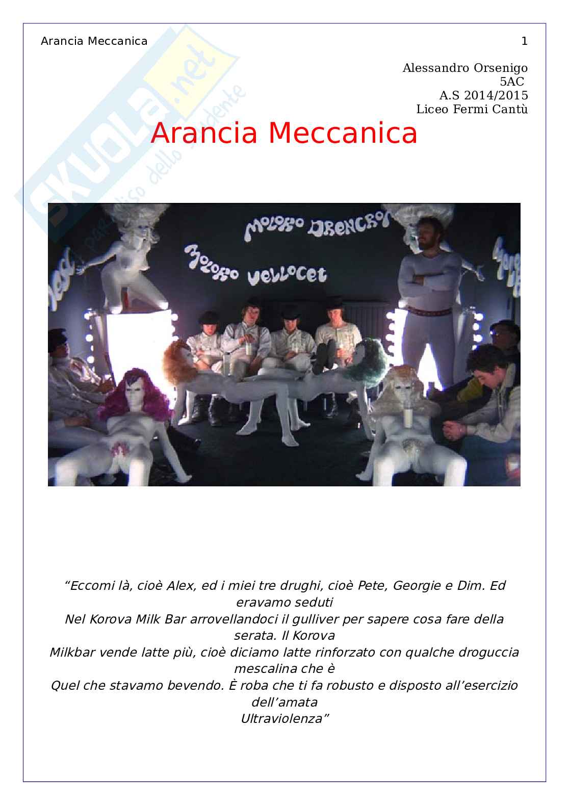 Nella tesina descrivo il celebre film Arancia meccanica. Arancia Meccanica noto film del ancor più celebre regista Stanley Kubrick viene presentato al mondo tra censure e critiche nel 1972 durante la Mostra di Venezia. Arancia Meccanica, tratto dall’omonimo romanzo di Anthony Burgess ,è rimasto storia del cinema, oltreché come fonte di citazioni letterarie e iconograficheanche come pellicola di denuncia infatti venne subito ritenuta scandalosa sia per la violenza, sia per il suo messaggio di critica sociale e politica. La storia metteva in scena la doppiezza della politica celata sotto un’etica falsa, la violenza giovanile e l’inefficienza della giustizia: temi che non sembrano poi così distanti dai nostri giorni.
