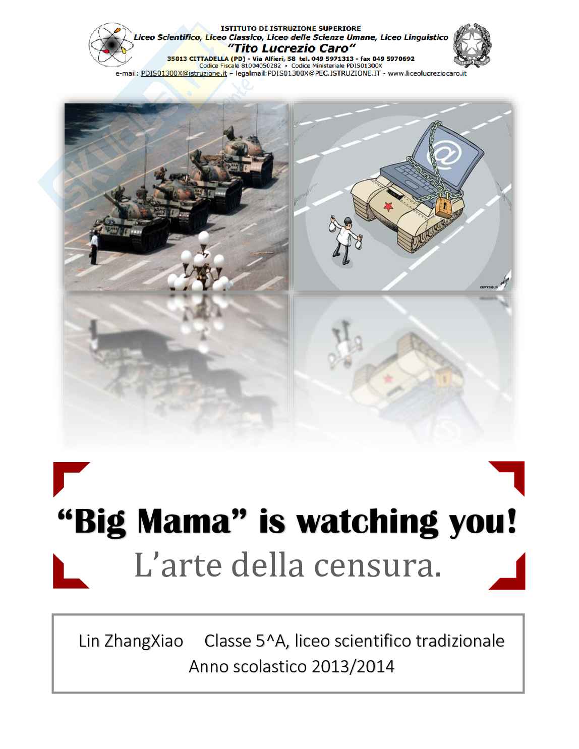La seguente tesina di maturità tratta del tema della censura. La tesina abbraccia anche i seguenti argomenti nella varie discipline scolastiche: la Primavera democratica cinese in Storia; Newspeak, Doublespeak in Inglese; La teoria freudiana della rimozione in Filosofia; Cyber censura, progetto Big Mama e Great Firewall of China in Informatica.