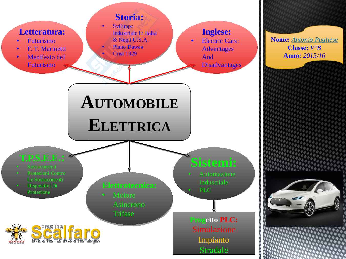 La seguente tesina di maturità descrive l'automobile elettrica. La tesina permette i collegamenti con le seguenti materie scolastiche: in Letteratura il futurismo, in Storia la Rivoluzione Industriale in Italia e negli USA con successiva crisi del 1929, in Inglese Electric Cars, in Elettrotecnica il motore asincrono trifase, in TPSEE le sovracorrenti, in Sistemi l'automazione industriale e PLC con successivo progetto presentato.