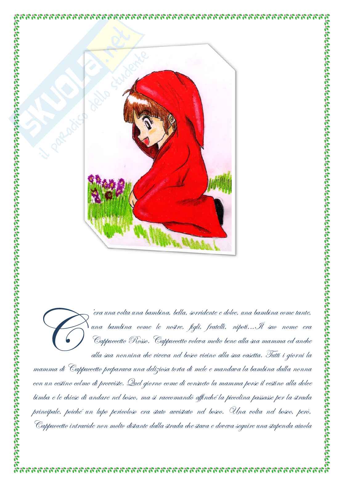 Sommario: C 'era una volta una bambina, bella, sorridente e dolce, una bambina come tante, una bambina come le nostre, figli, fratelli, nipoti...Il suo nome era Cappuccetto Rosso. Cappuccetto voleva molto bene alla sua mamma ed anche alla sua nonnina che viveva nel bosco vicino alla sua casetta. Tutti i giorni la mamma di Cappuccetto preparava una deliziosa torta di mele e mandava la bambina dalla nonna con un cestino colmo di provviste. Quel giorno come di consueto la mamma porse il cestino alla dolce bimba e le chiese di andare nel bosco, ma si raccomandò affinché la piccolina passasse per la strada principale, poiché un lupo pericoloso era stato avvistato nel bosco. Una volta nel bosco, però, Cappuccetto intravide non molto distante dalla strada che stava e doveva seguire una stupenda aiuola di tanti fiori dai colori sgargianti. Stupita da quello spettacolo, abbandonò il sicuro sentiero per raccogliere quei fiori profumati e portarli alla nonna. Come tutti i bambini Cappuccetto guardava tutte le cose con stupore e meraviglia, possedeva una speciale sensibilità , quella sensibilità che solo un fanciullo può avere. E così che Pascoli definì il "fanciullino" quel bambino che è dentro ognuno di noi da sempre e per sempre. Quello che in tenera età confonde la sua voce con la nostra, ma che "rimane piccolo anche quando noi ingrossiamo e arrugginiamo la voce" mentre "egli fa sentire il suo tinnulo squillo come di campanella", quello che "piange e ride senza un perché di cose, che sfuggono ai nostri sensi ed alla nostra ragione", che guarda tutte le cose con stupore e meraviglia senza cogliere i rapporti logici di causa-effetto, ma intuendo; il fanciullino è colui che "scopre nelle cose le relazioni più ingegnose", che riempie ogni oggetto della propria immaginazione e dei propri ricordi, trasformandolo in simbolo. Il poeta per Pascoli è colui che riesce ancora ad udire la voce del fanciullino che vive dentro di noi, che riesce a tenerlo vivo. Il poeta è colui che pur mantenendo una razionalità di fondo, organizzatrice della metrica poetica, possiede una sensibilità speciale, che gli consente di caricare di significati ulteriori e misteriosi anche gli oggetti più comuni; il poeta deve saper combinare il talento della fanciullezza (saper vedere), con quello della vecchiaia (saper dire). Infatti, il fanciullino riesce a cogliere negli oggetti quel qualcosa che agli occhi di un adulto sembra futile, mentre "noi accendiamo negli occhi un nuovo desiderare", egli vi tiene fissa "la sua antica serena meraviglia".