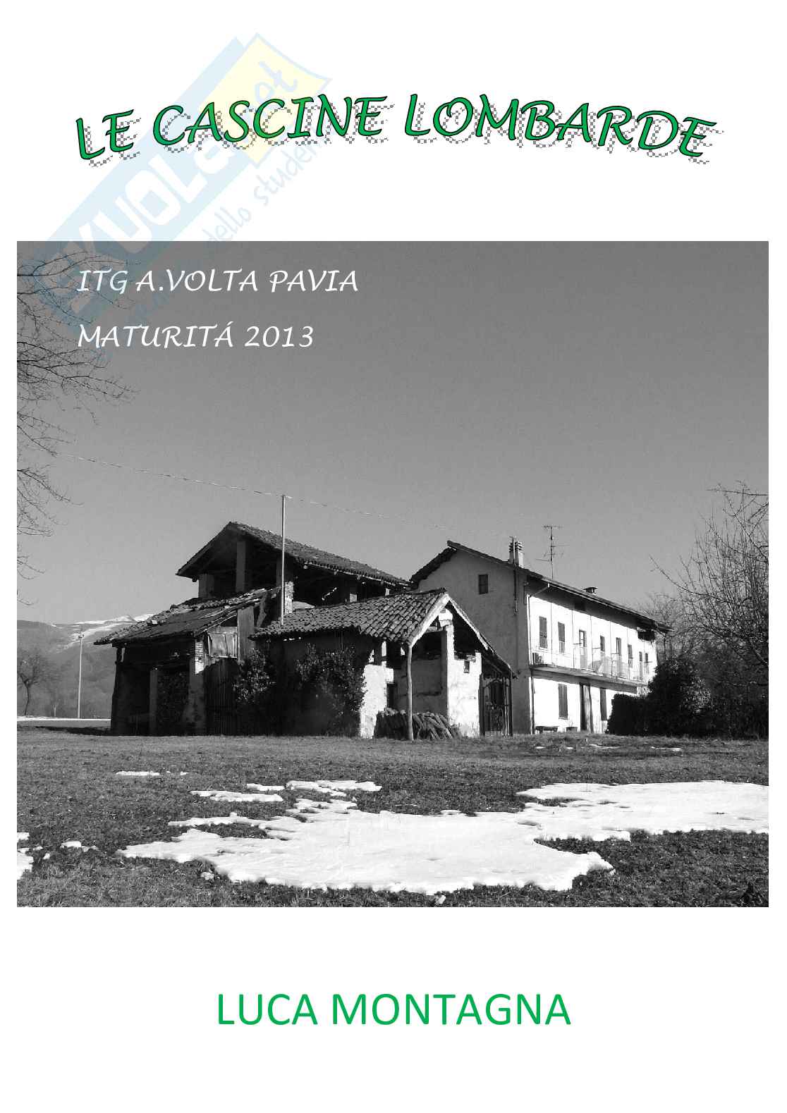 Questa tesina di maturità descrive le cascine lombarde. La cascina a corte, o più semplicemente cascina, è una struttura agricola tipica della Pianura Padana lombarda e in parte piemontese ed emiliana, dove si usa prevalentemente il termine di corte colonica. Si tratta di una grossa fattoria al centro di un'azienda agricola di decine di ettari, normalmente almeno 40-50, ma a volte superiore ai 100. All'interno della Cascina sono presenti stalle, fienili, sili, granai, caseifici, pozzi-fontane, forni, magazzini, mulini ed abitazioni dei contadini riunite in un'unica struttura. Tali strutture sono sparse in mezzo alla campagna, lontane qualche chilometro dai centri abitati. La pianta di questa struttura è