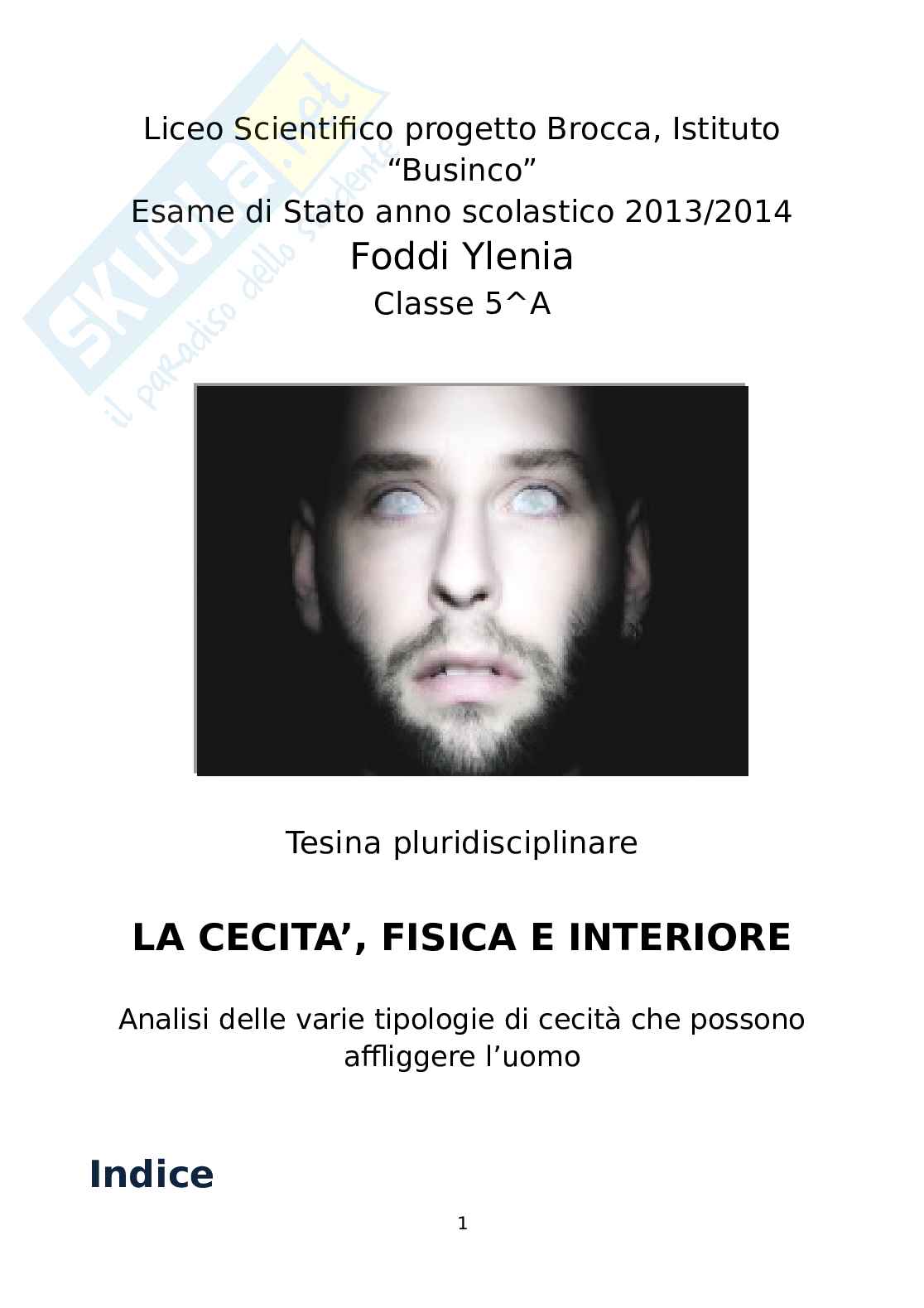 La seguente tesina di maturità tratta del tema della cecità. La tesina abbraccia anche i seguenti argomenti nella varie discipline scolastiche: cause e tipologie della cecità fisica in Biologia, le protesi oculari fotovoltaiche e principio di funzionamento del fotodiodo in Fisica; Gabriele D'Annunzio e "Notturno" in Italiano; James Joyce, il concetto di "epiphany" e analisi di "Araby" in Inglese; la cecità degli adulti ne "Il piccolo principe" in Francese; La cecità dell'Essere in Kant e Shopenhauer; concetto di fenomeno, noumeno e "velo di Maya"; la cecità nella filosofia buddhista (Udana) in Filosofia; Analisi del protagonista Ernesto Santamaria nell'opera "Las tres heridas" ("Il gioco segreto del tempo" nella versione italiana) di Paloma Sánchez-Garnica in Spagnolo; Il genocidio armeno; cenni alla Shoah e al conflitto siriano in Storia; Petronio e la critica al falso moralismo in Latino.