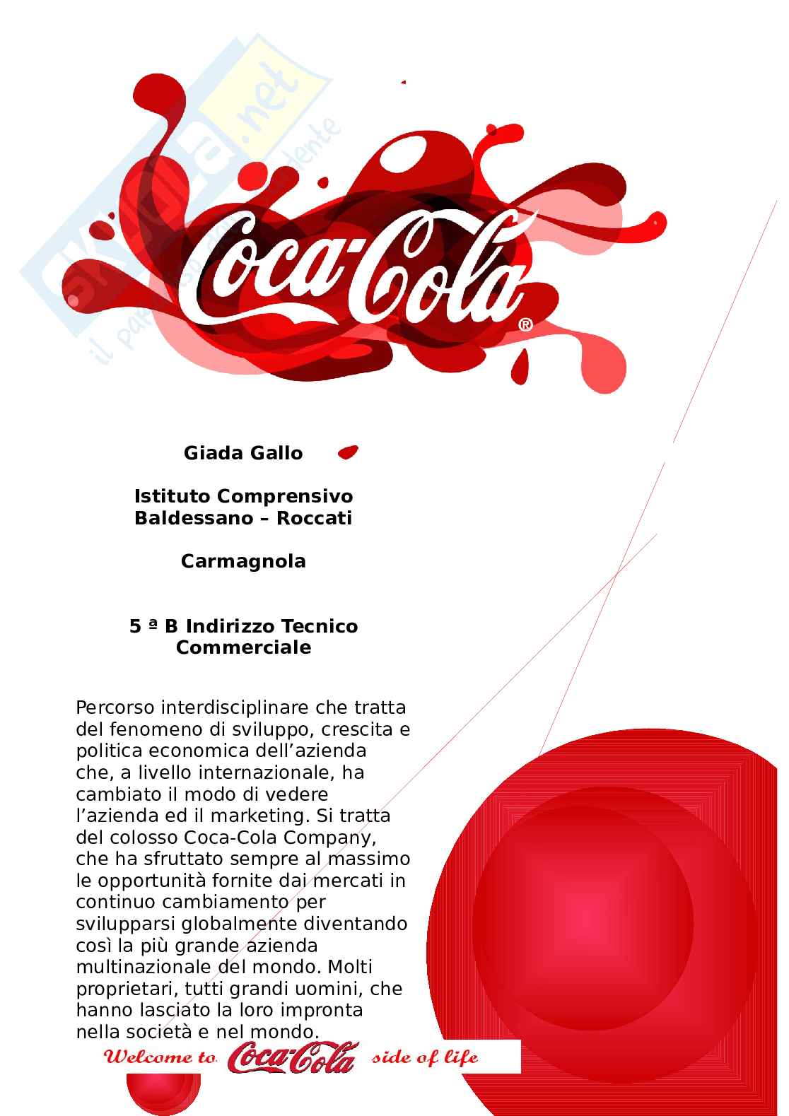 Questa tesina di maturità tratta del fenomeno di sviluppo, crescita e politica economica dell’azienda che, a livello internazionale, ha cambiato il modo di vedere l’azienda ed il marketing. Si tratta del colosso Coca-Cola Company che ha sfruttato sempre al massimo le opportunità fornite dai mercati in continuo cambiamento per svilupparsi globalmente diventando così la più grande azienda multinazionale del mondo. Molti proprietari, tutti grandi uomini, che hanno lasciato la loro impronta nella società e nel mondo. La tesina mira quindi a descrivere la storia di una delle compagnie che registra più successo nel mondo.