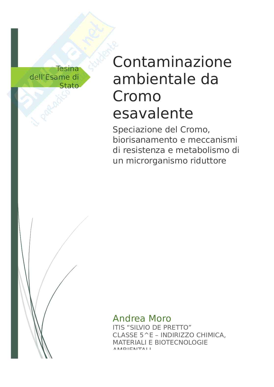 La presente tesina di maturità tratta la contaminazione ambientale da Cromo esavalente, o Cr(VI), che si è rivelato un problema preoccupante a causa della forte mobilità nell’ambiente di questo inquinante estremamente tossico e cancerogeno. Seguendo questo filo conduttore vengono approfondite in una prima parte le modalità previste per la determinazione chimica della concentrazione di questa sostanza nelle matrici suolo e acqua, conoscendo i valori limite stabiliti per legge; in seguito si illustrano i metodi di bonifica dei siti inquinati, con particolare attenzione alle modalità di biorisanamento e ai fattori che ne condizionano la fattibilità. Nella seconda parte si discute dell’impiego di un ceppo batterico, Pseudomonas corrugata, in opere di bonifica biologica del cromo esavalente, soffermandosi sulle capacità di resistenza e di versatilità metabolica di questo microrganismo. La tesina permette il collegamento con le varie materie scolastiche.