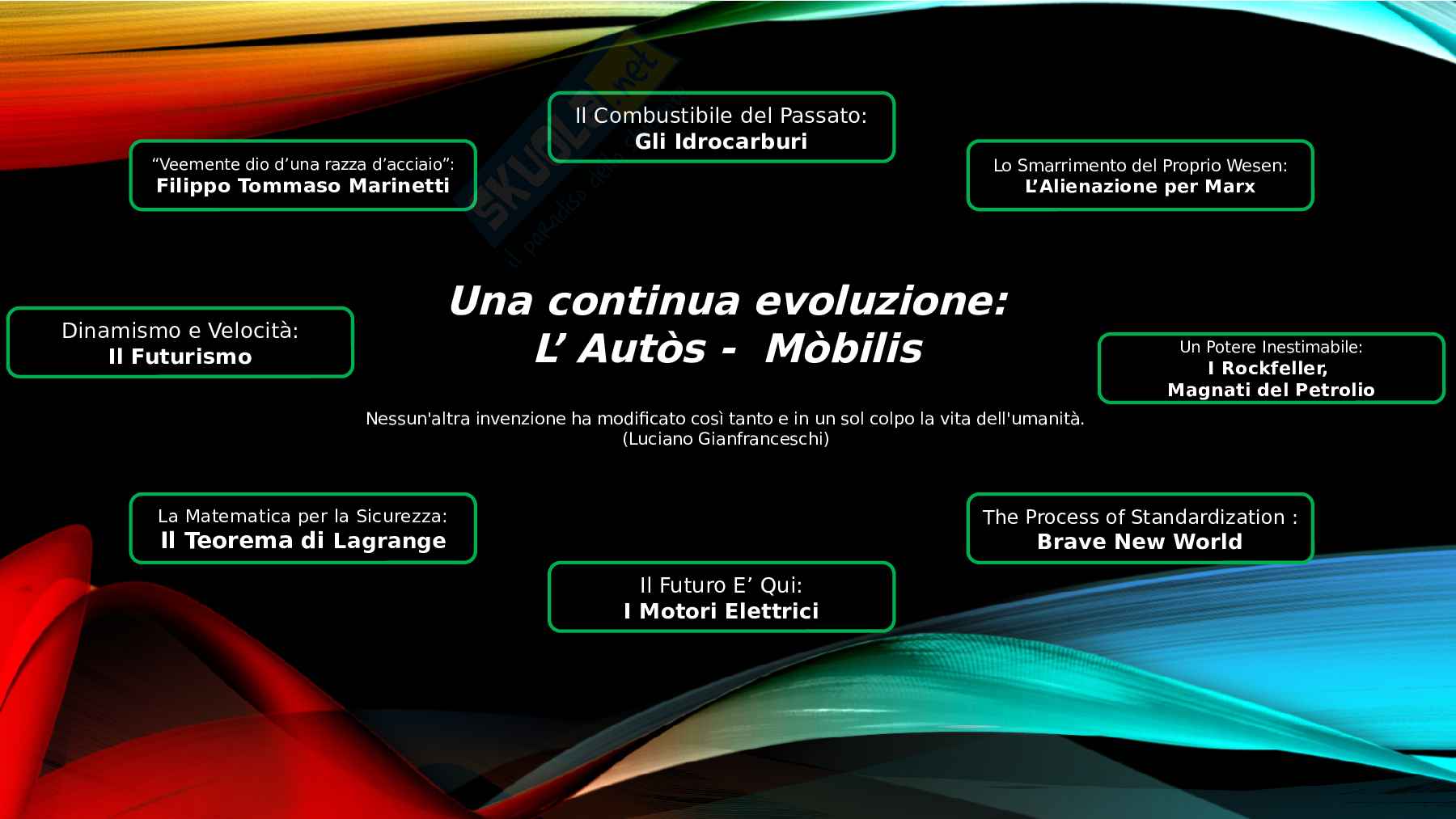 La seguente tesina di maturità in power point descrive l'automobile. La tesina permette i seguenti collegamenti con le varie materie scolastiche: in Italiano Filippo Tommaso Marinetti, in Arte il Futurismo, in Matematica il Teorema di Lagrange, in Filosofia l'alienazione per Marx, in Storia i Rockfeller, Magnati del Petrolio, in inglese the Brave New World, in chimica gli Idrocarburi e in fisica i motori elettrici.