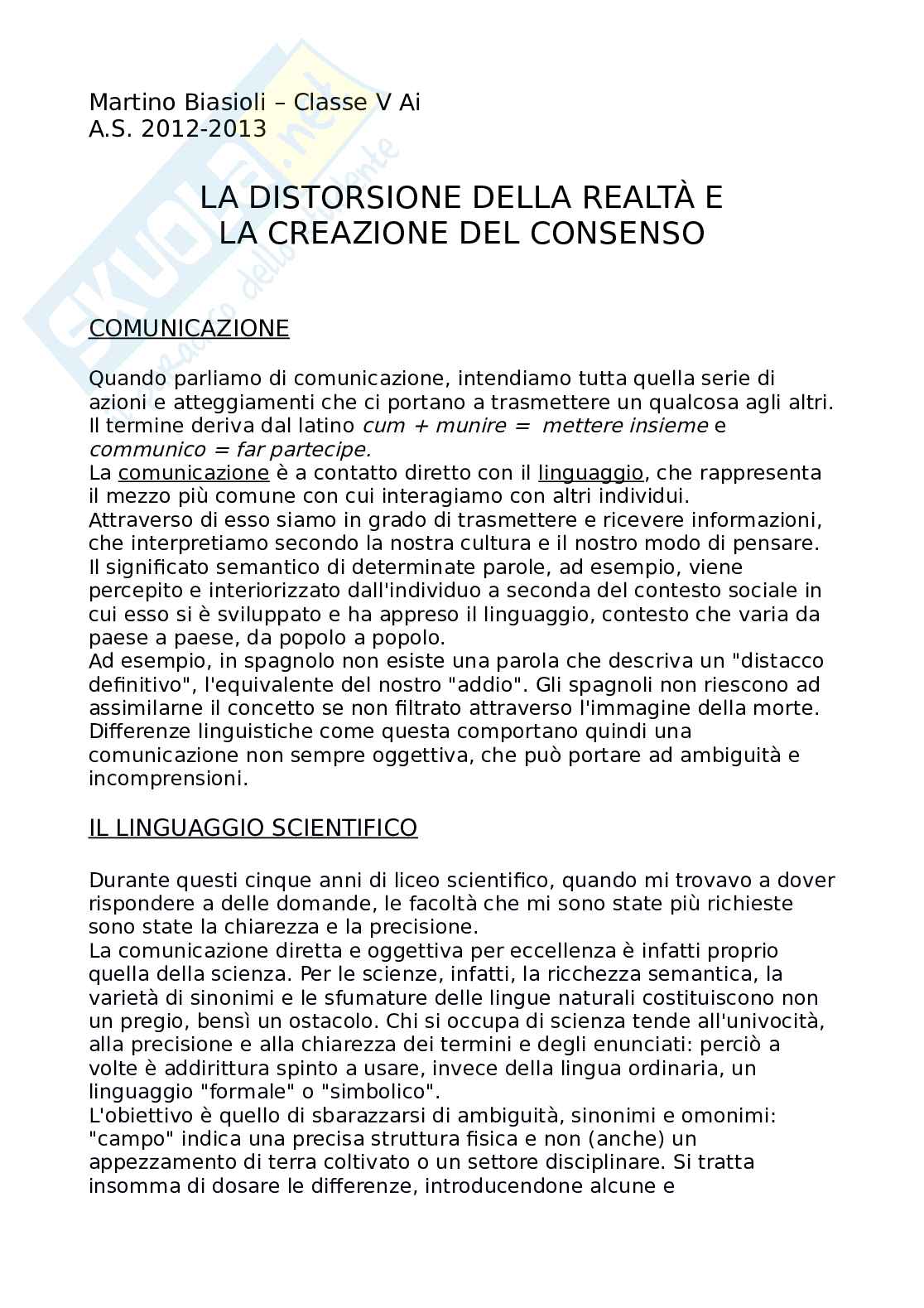 Questa tesina di maturità descrive la costruzione del consenso, che porta alla distorsione della realtà. Gli argomenti che la tesina tratta sono i seguenti: in Matematica e fisica il linguaggio scientifico, in Storia il fascismo e il nazismo, in Inglese Animal Farm.