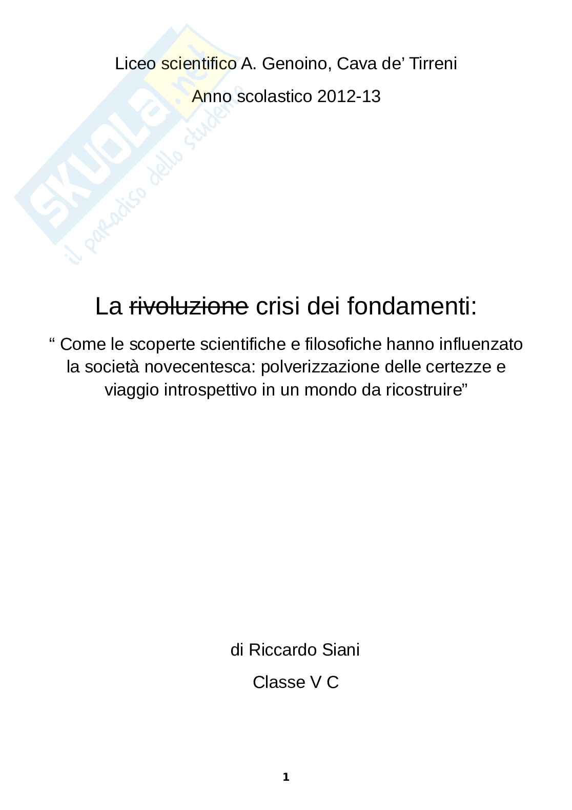 Questa tesina di maturità tratta della crisi dei fondamenti scientifici. Gli argomenti che vengono sviluppati nella tesina sono i seguenti: in Latino Plinio il Vecchio, in Filosofia l'evoluzione del metodo scientifico; il neopositivismo e Popper, in Inglese Flatland; Victorian Age and its compromises, in Storia dell'arte Corpus Hypercubus, in Matematica la quarta dimensione, le geometrie non euclidee, in Fisica la relatività speciale e generale, in Geografia astronomica i buchi neri ( approfonditi con libri e riviste), in Italiano la definizione del Romanticismo di Binni; decadentismo; Pirandello e i Quaderni di Serafino Gubbio operatore.