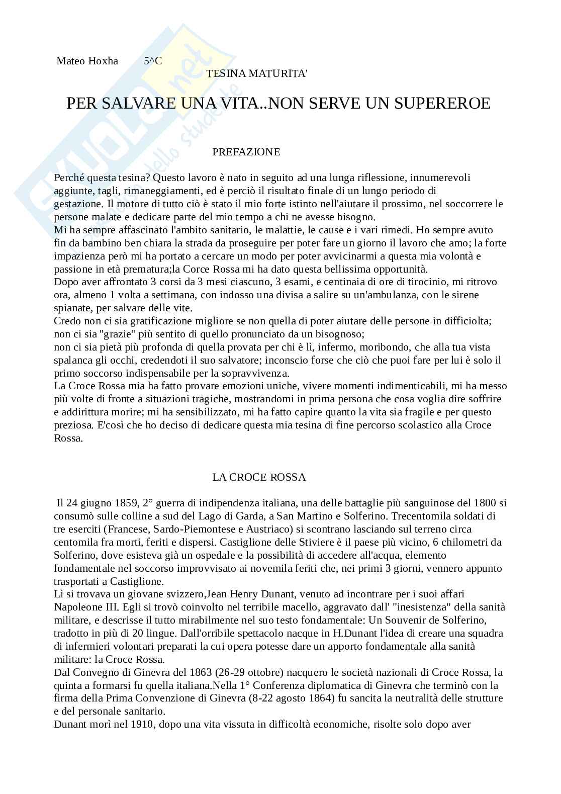 La Croce Rossa mia ha fatto provare emozioni uniche, vivere momenti indimenticabili, mi ha messo più volte di fronte a situazioni tragiche, mostrandomi in prima persona che cosa voglia dire soffrire e addirittura morire; mi ha sensibilizzato, mi ha fatto capire quanto la vita sia fragile e per questo preziosa. E'così che ho deciso di dedicare questa mia tesina di fine percorso scolastico alla Croce Rossa.