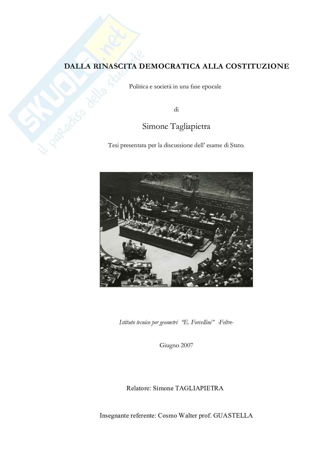 La tesi ripercorre, in modo critico ed articolato, la rinascita democratica dell'Italia nel dopoguerra e la fase costituente.
