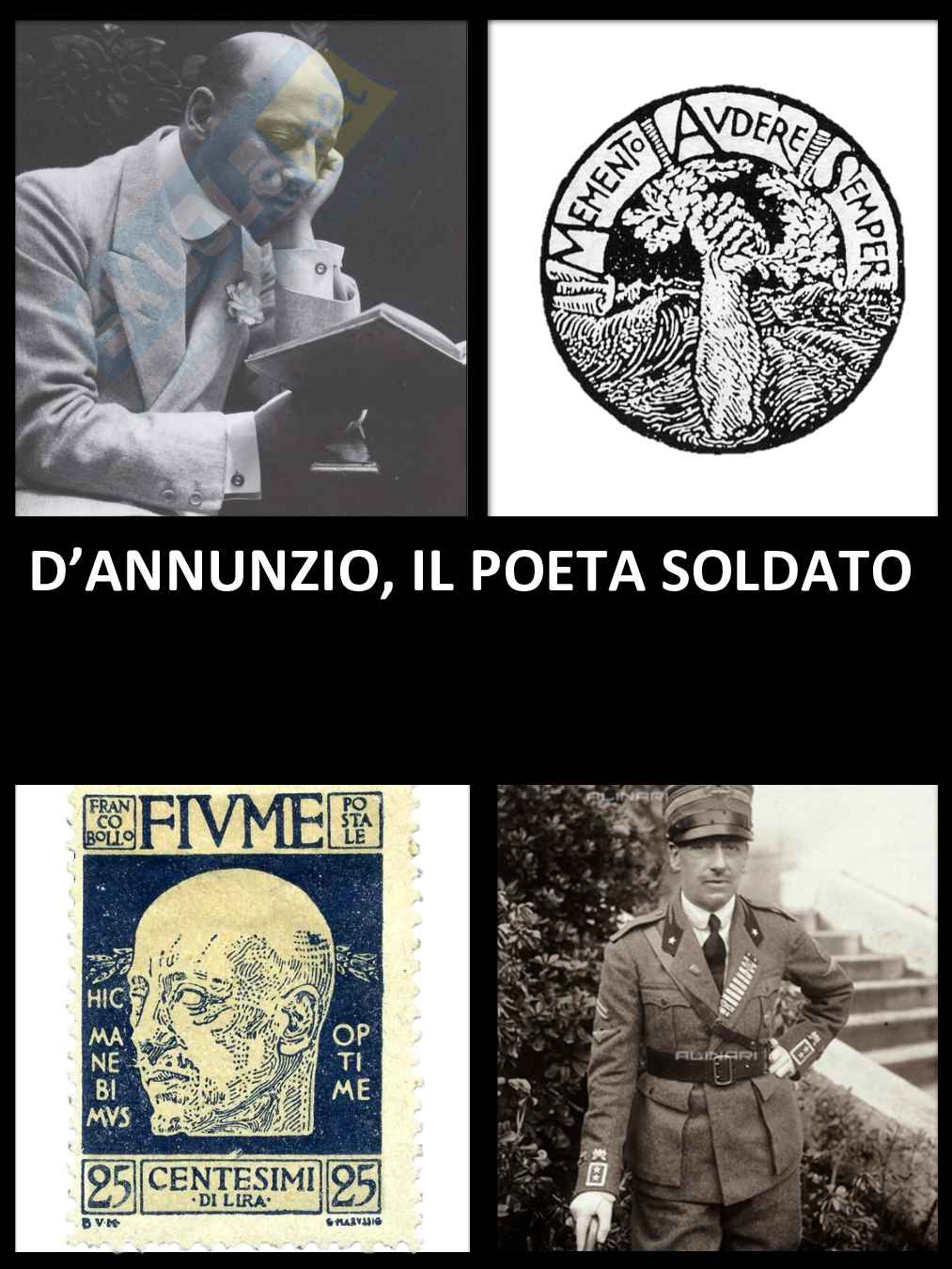 Questa tesina di maturità vuole analizzare la figura del poeta italiano Gabriele D'Annunzio, descrivendo le sue principali imprese come quella di Fiume. La tesina si sofferma principalmente sugli aspetti storiografici delle imprese dannunziane. Inoltre il personaggio Gabriele D'Annunzio ha avuto una grande influenza nella mitografia fascista.