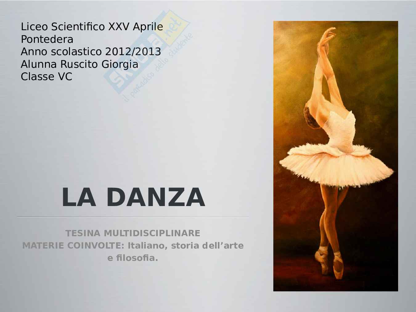 La seguente tesina ha come obiettivo quello di descrivere la danza. Questa tesina di maturità collega la danza con alcuni autori che, in alcune discipline, l'hanno presa in esame e resa oggetto delle loro opere. Questi autori sono Edgar Dégas, Friedrich Nietzsche e Eugenio Montale.