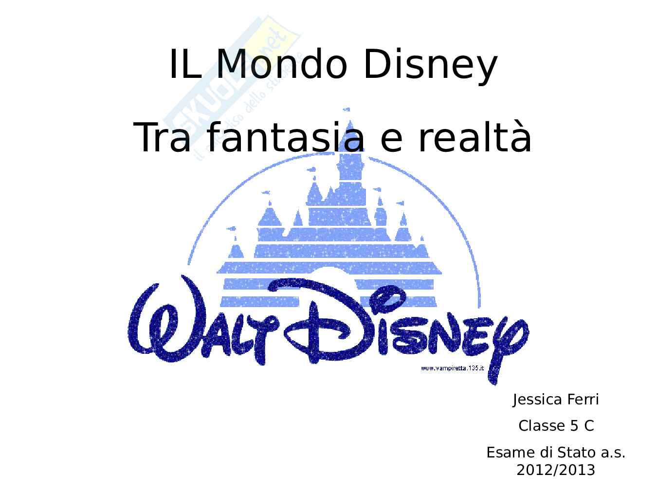 Questa tesina di maturità descrive il mondo Disney. Gli argomenti che la tesina permette di sviluppare sono i seguenti: in Turismo i parchi a tema, in Inglese mass tourism e Disney Cruise Line, in Economia il bilancio con zio Paperone, in Tecniche della comunicazione il gruppo con Qui, Quo, Qua, in Italiano il Fanciullino di Pascoli e Peter Pan, in Storia il nazismo con Paperino Der Fuehrer's Face (cortometraggio), in Spagnolo Dalì e Walt Disney, Destino ( cortometraggio), in Matematica i limiti con Paperino nel mondo della matemagica.