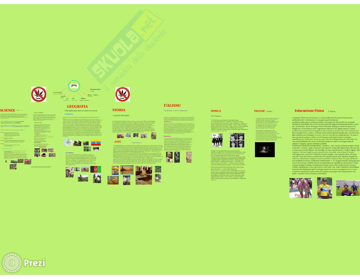 La seguente tesina per esame terza media tratta della droga, male comune a moltissimi adolescenti. Le materie collegate nella tesina sono: Italiano:D'Annunzio,Baudelaire, Storia:La guerra dell'Oppio, Geografia:Colombia e Afganistan, Musica:Eric Clapton, Arte:Monet Van Gogh, Educazione Fisica:Il doping.